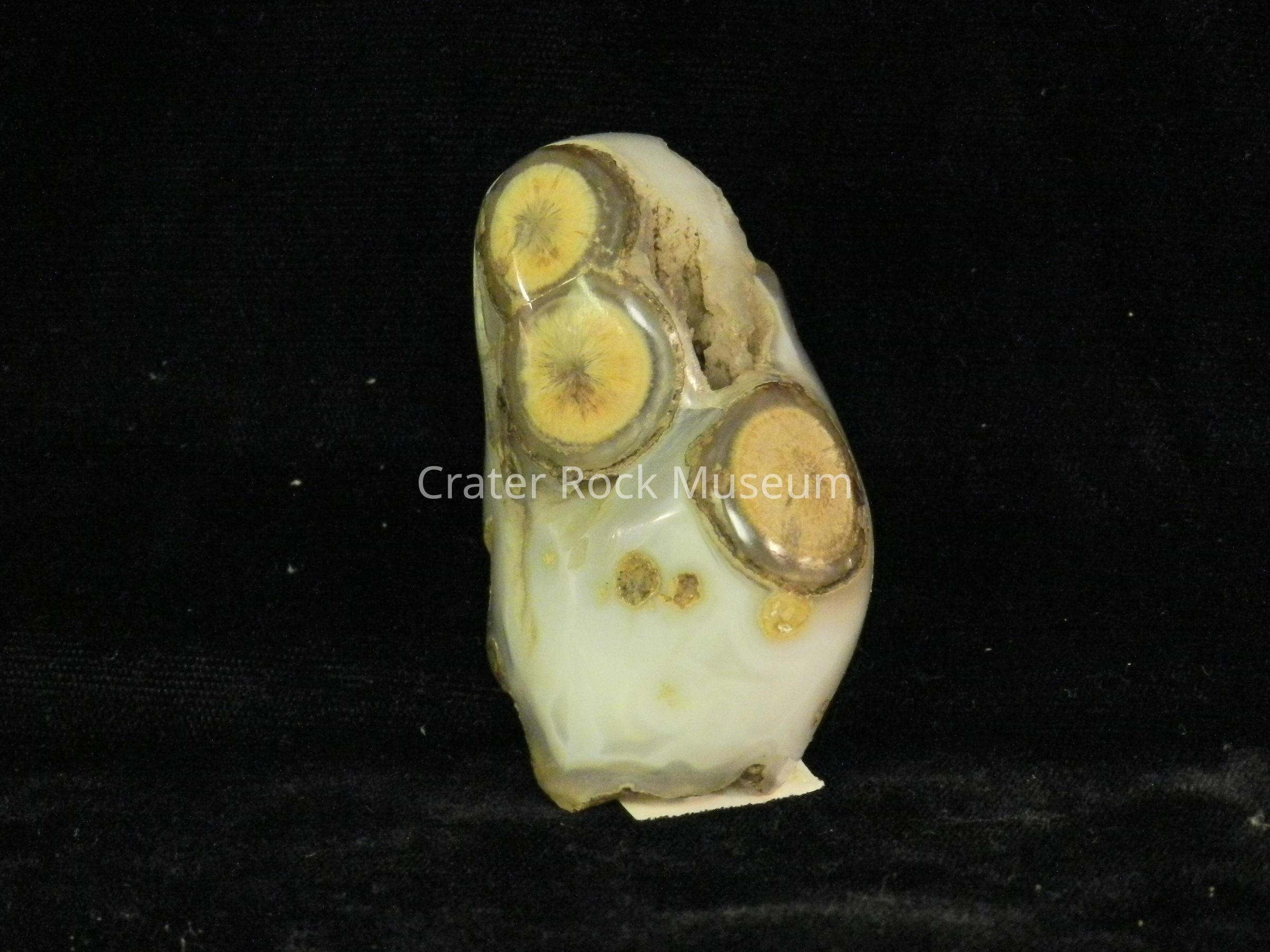 Description: Irregular shaped, polished sides. Translucent creamy white and gray with cavities and three brown and tan orbicular structures.