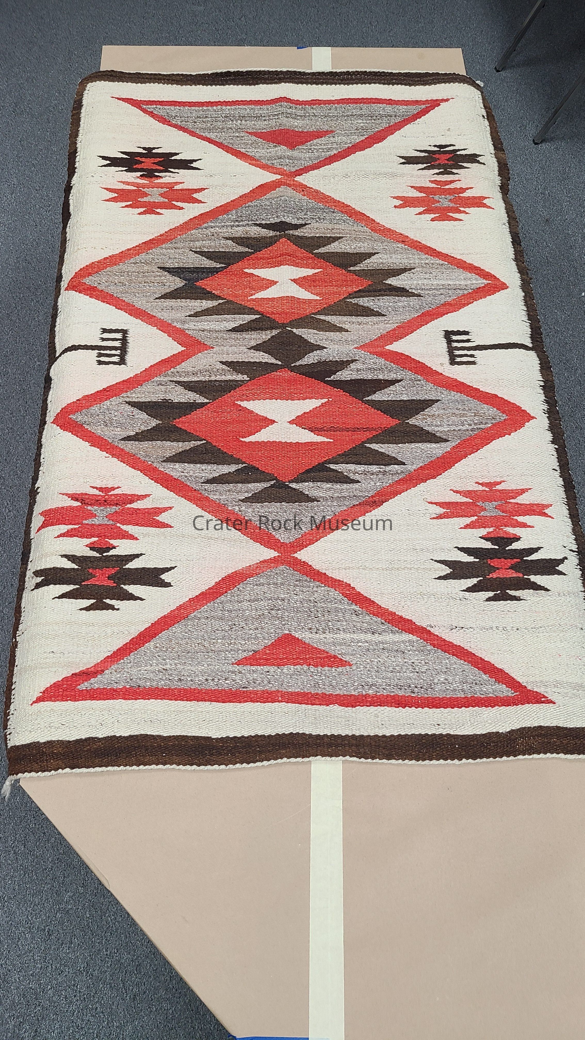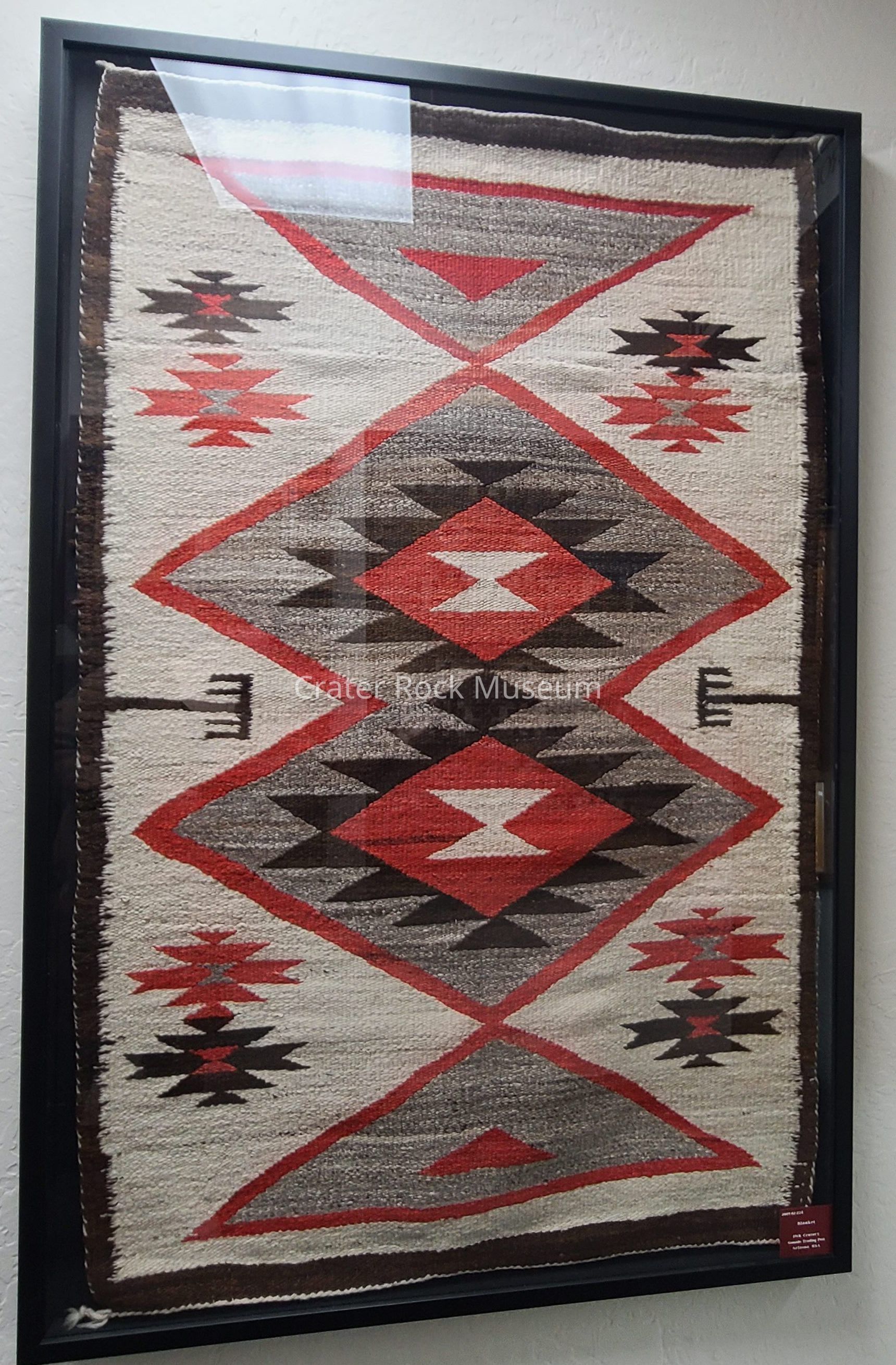 Woven blanket of brown, red, grey, and off white with geometric patternsLocation