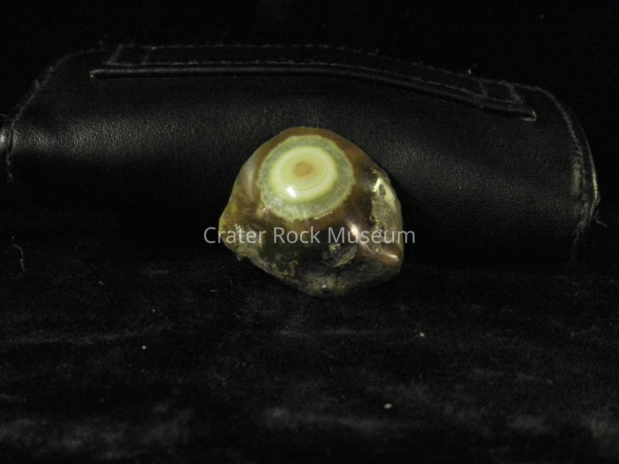 Description: Rough, flat back with rounded polished face. Light and dark brown with a single lime green and white orbicular structure.