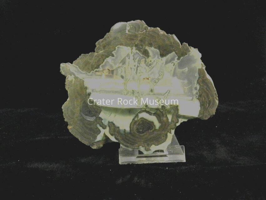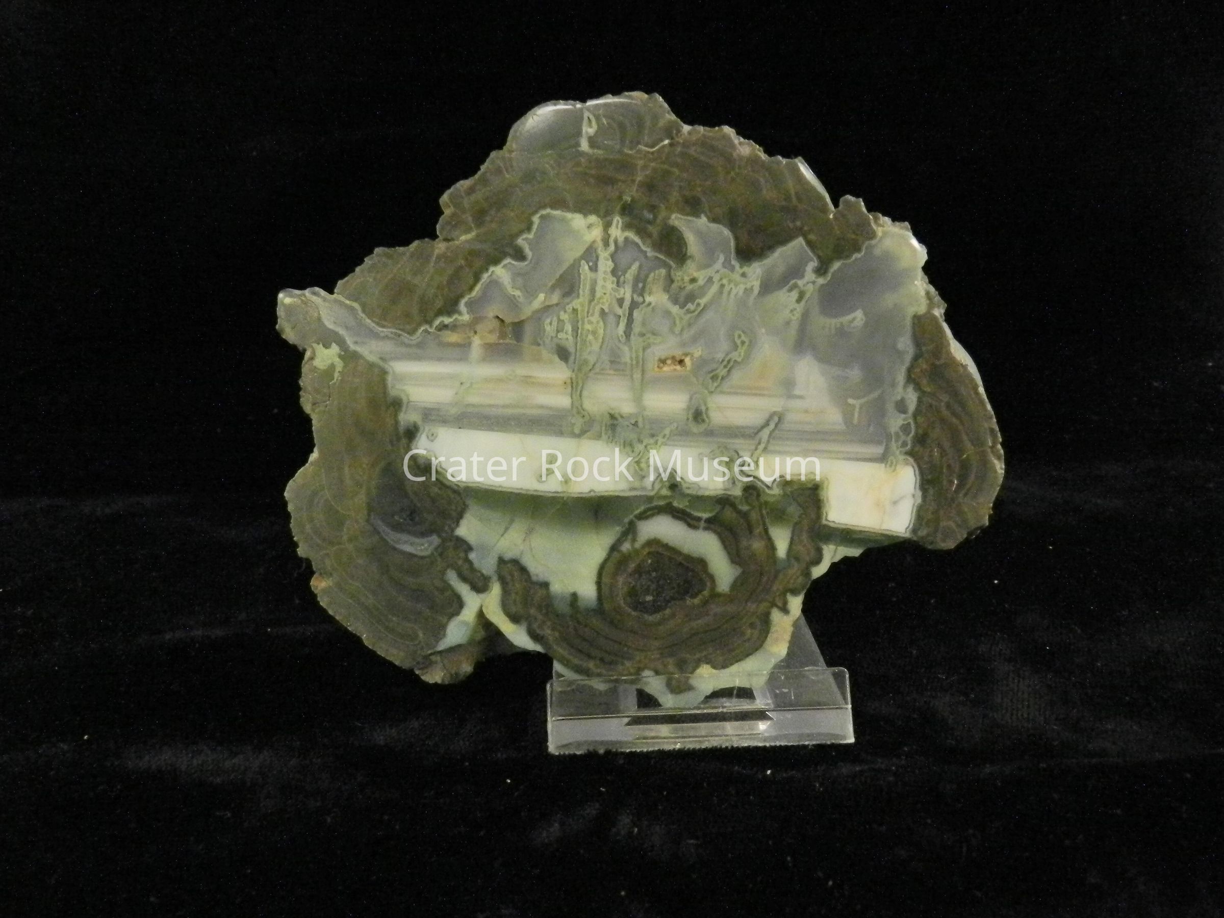 Description: Rough, rounded back with polished face. Reddish-brown banding on outer regions with light and dark lime green in inner areas with some translucent blue-gray and white bands towards center.Collection
