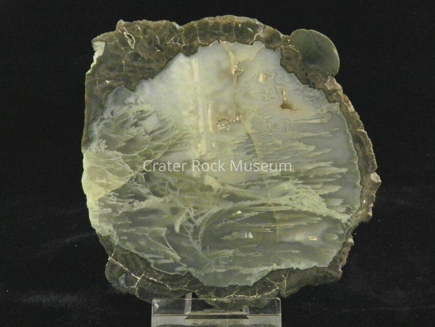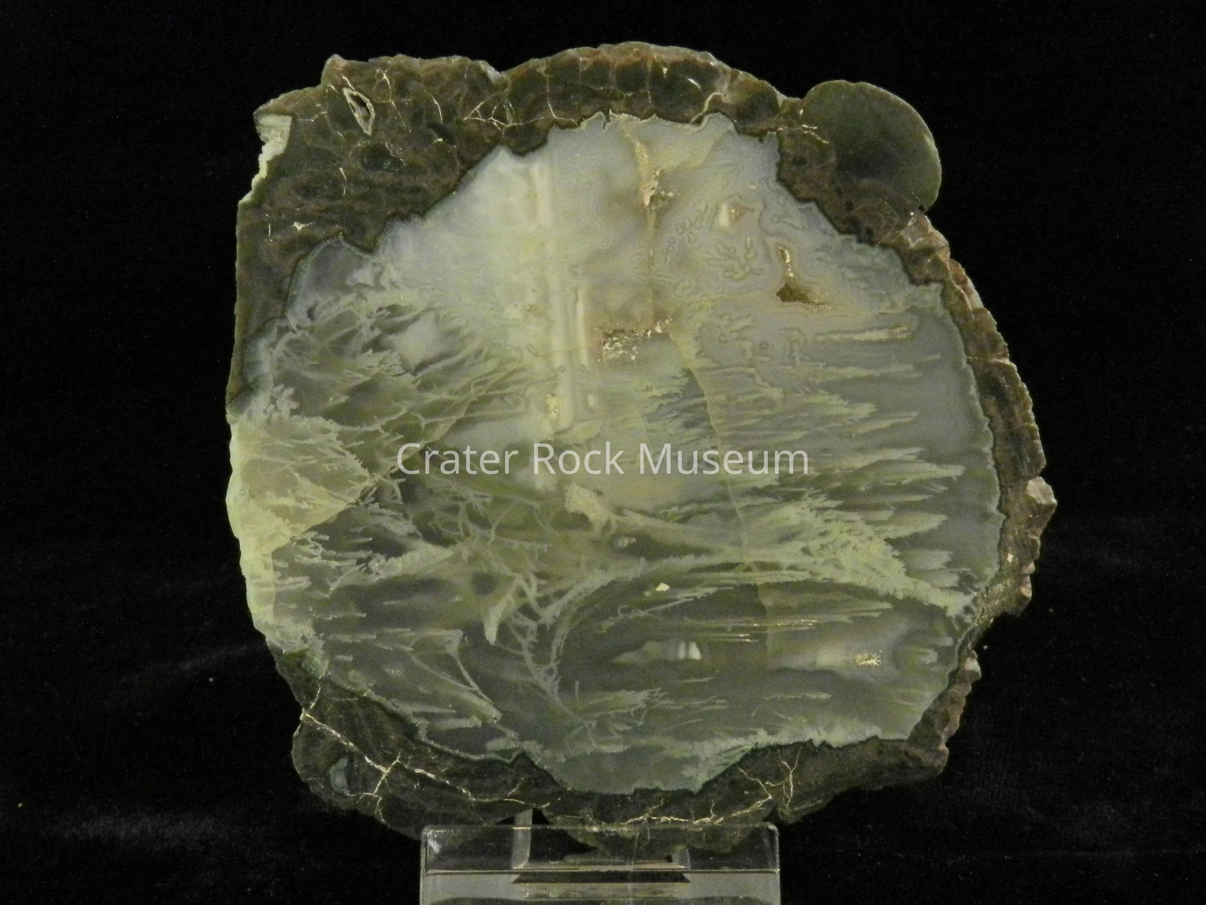 Description: Rough, rounded back with polished face. Gray to brown outer areas. Translucent dark gray and lime green inner areas.Collection
