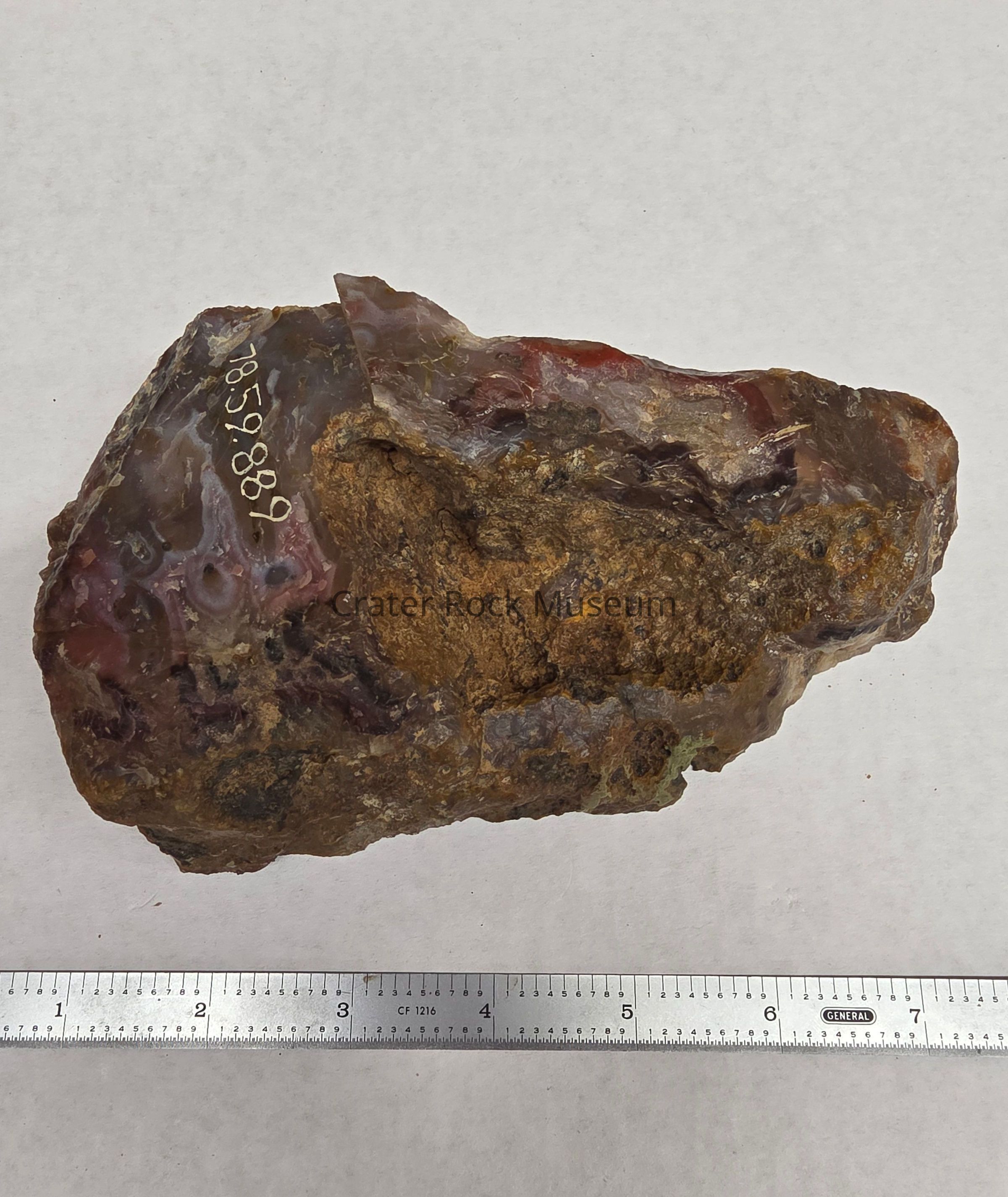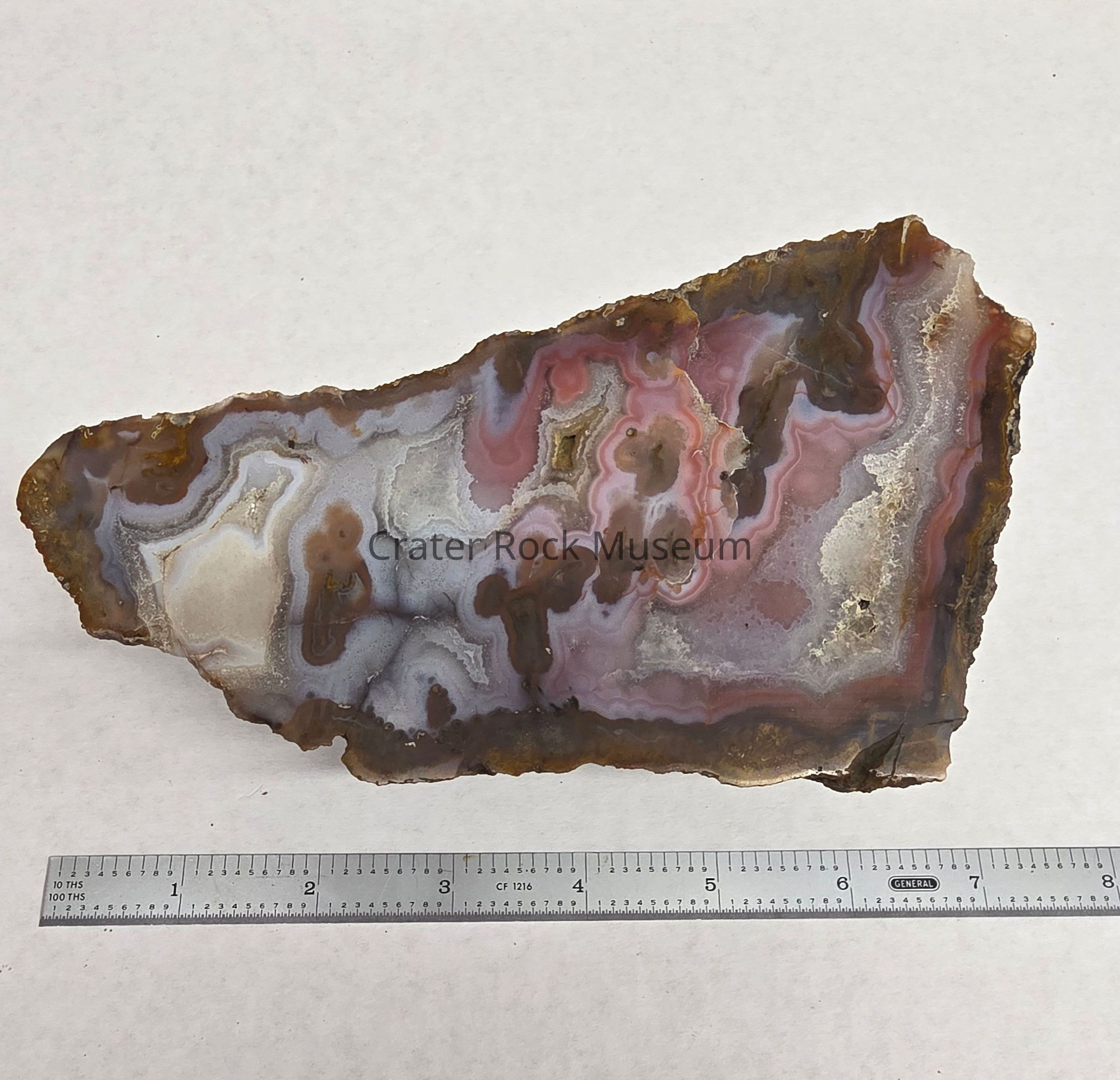 A slice and an end piece from an Agate from Deming, NM. Polished sides show Crystalline, Blue and Pink Agate with Stalactites and Brown Moss inclusions. Brown Moss is seen again along outer edge.Collection