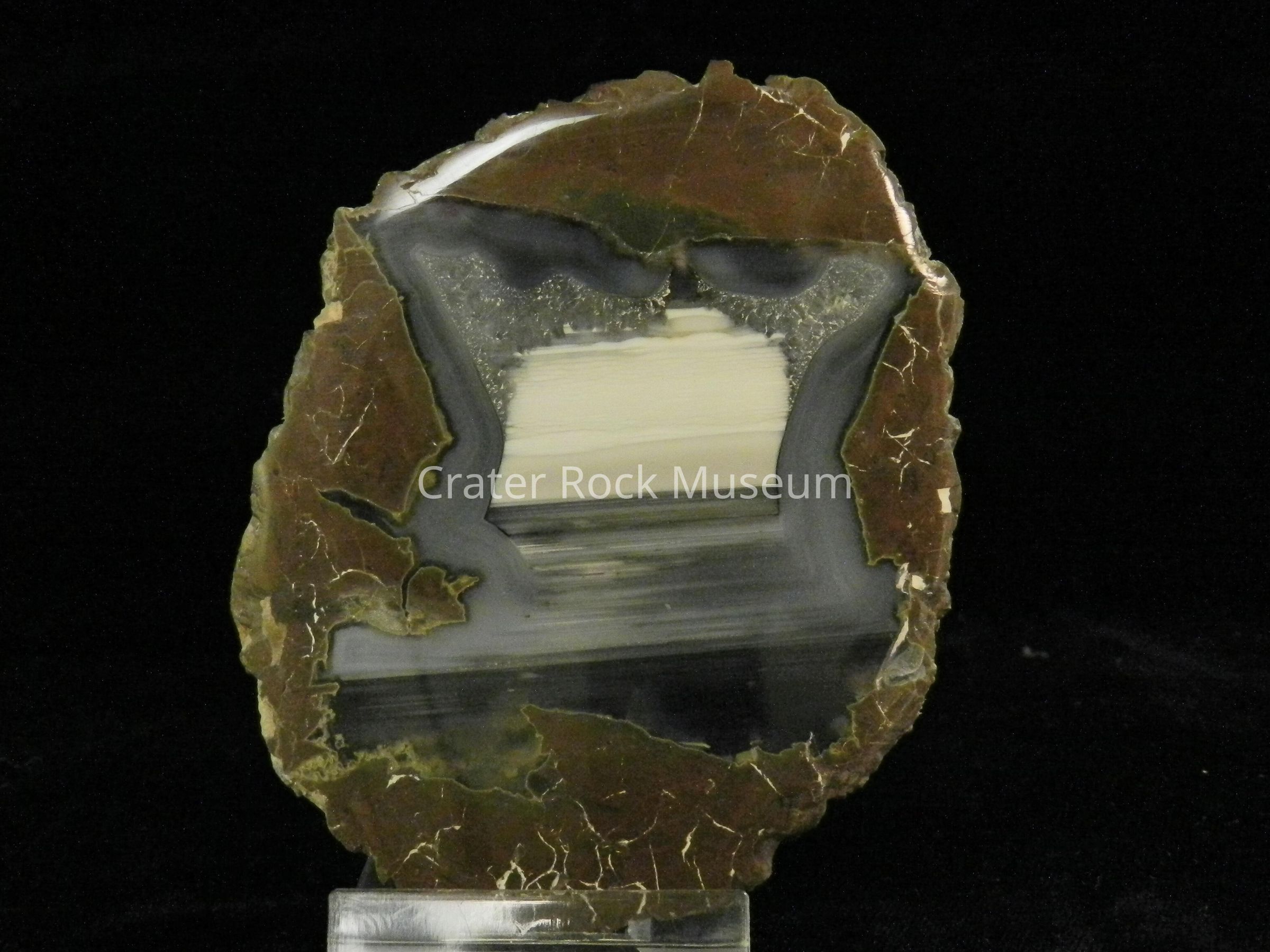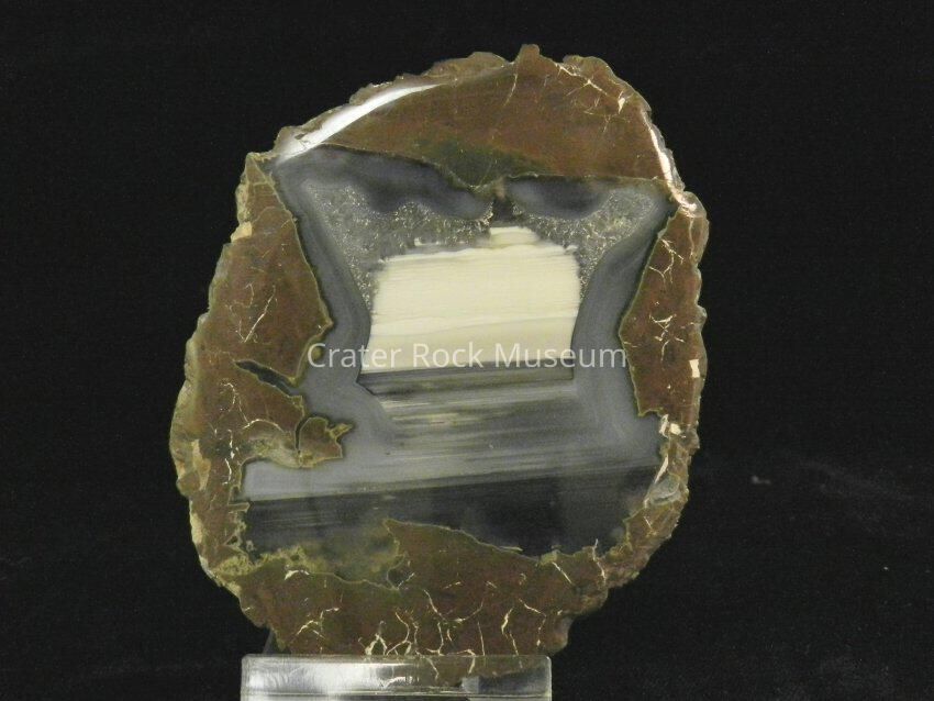 Description: Rough, rounded back with polished face. Reddish-brown outer regions with translucent blue-gray and dark gray banding with a rectangular white area towards center.Collection