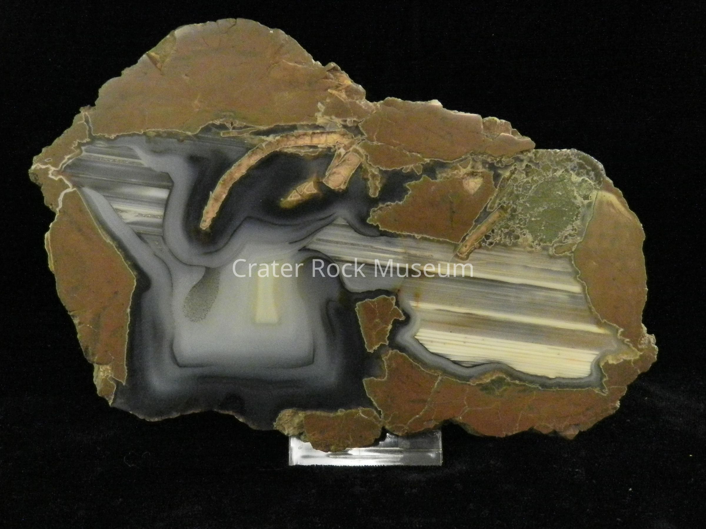 Description: Rough, rounded back with polished face. Reddish-brown outer regions with translucent blue-gray and white banding towards center. One area has a distinct crystalline structure.Collection
