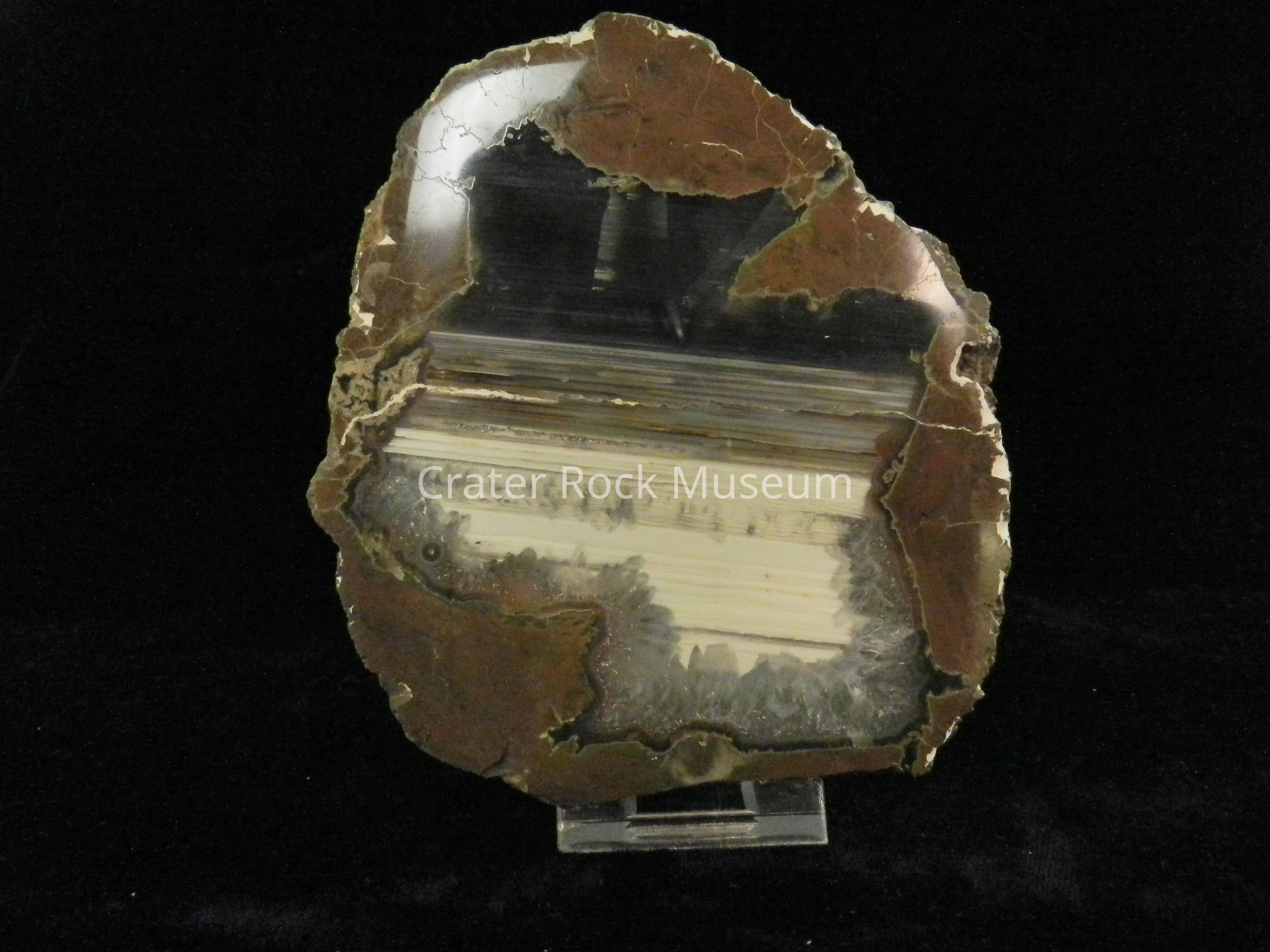 Description: "Double" Thunderegg with rough, rounded back and polished face. Reddish-brown outer regions with distinct white and gray banding and an area of light and dark blue-gray swirled bands.Collection