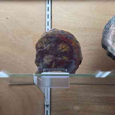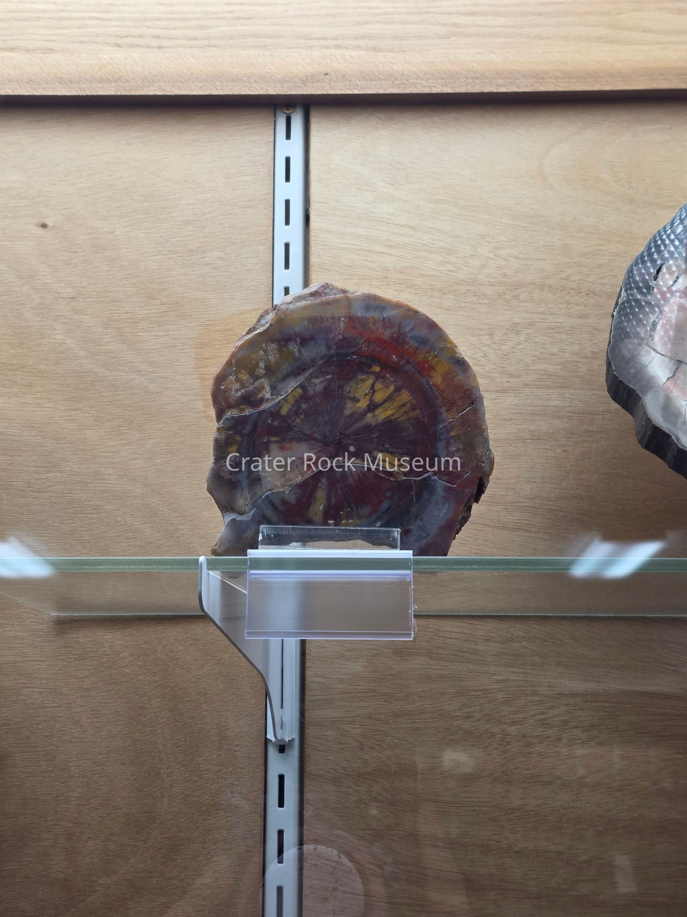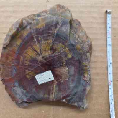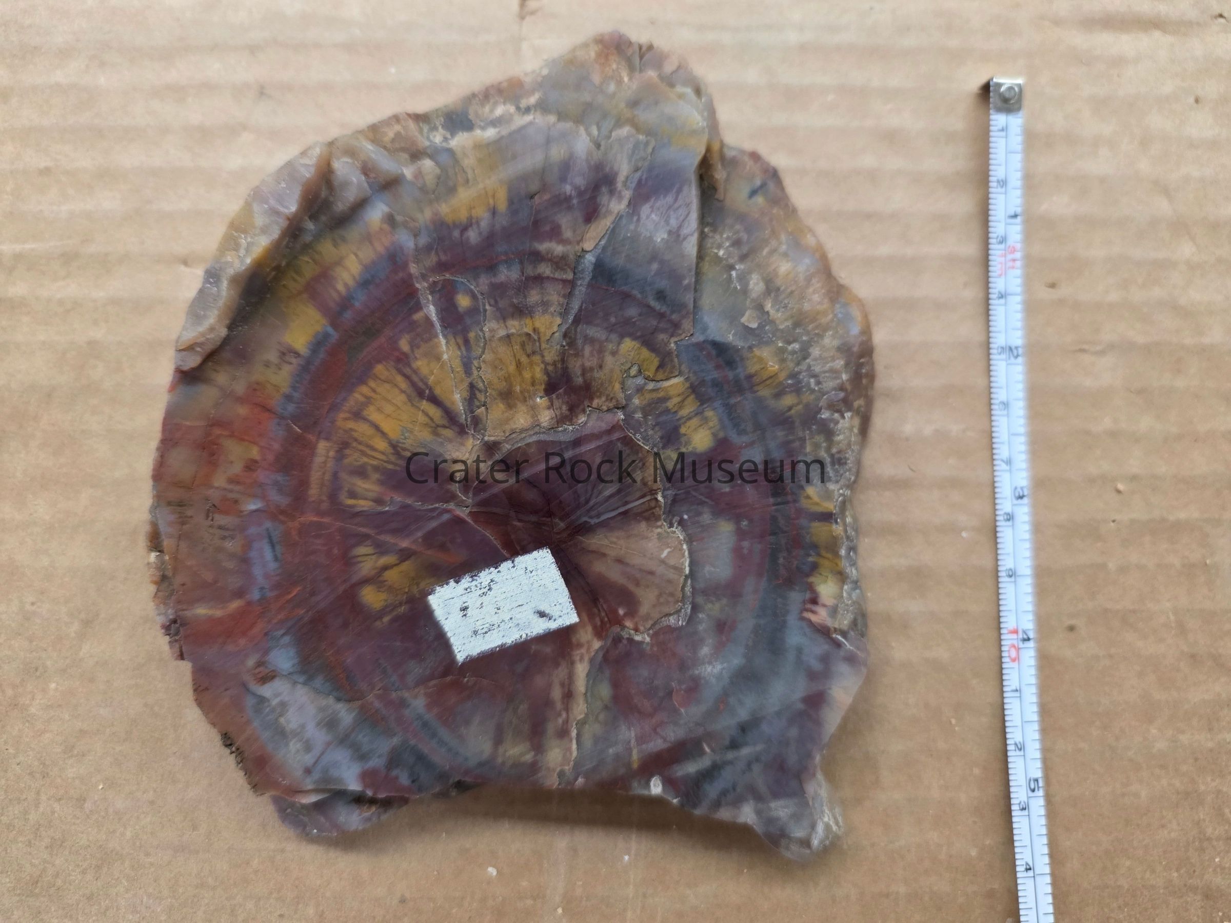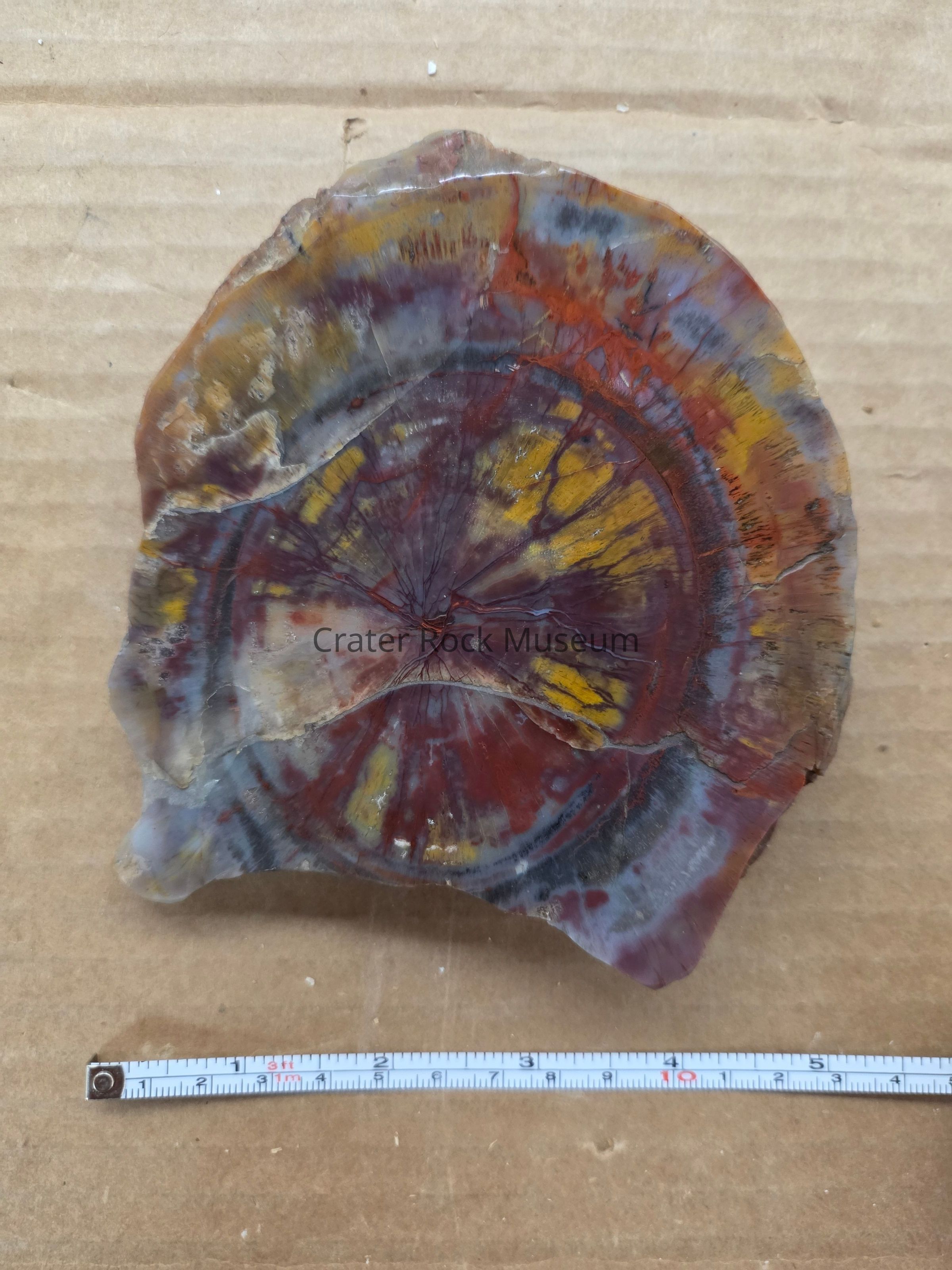 Rainbow patterned, fairly complete round slab of red, purple, green, yellow, and orange.Location