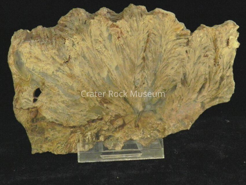 Description: Thin slab with polished face. Light tans and browns in a plume configuration emitting fron a central point.Collection