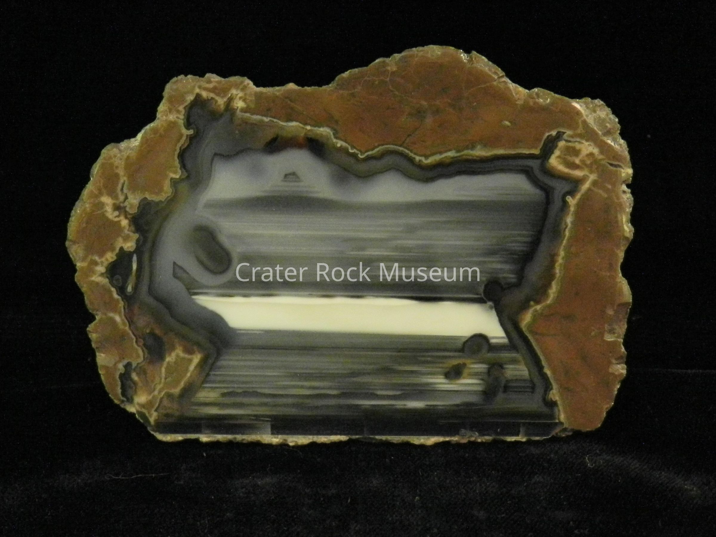 Description: Rough, rounded back with polished face. Reddish-brown outer regions with translucent blue-gray banding with one white thick band towards center.Collection