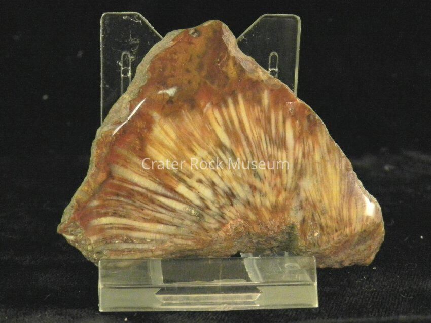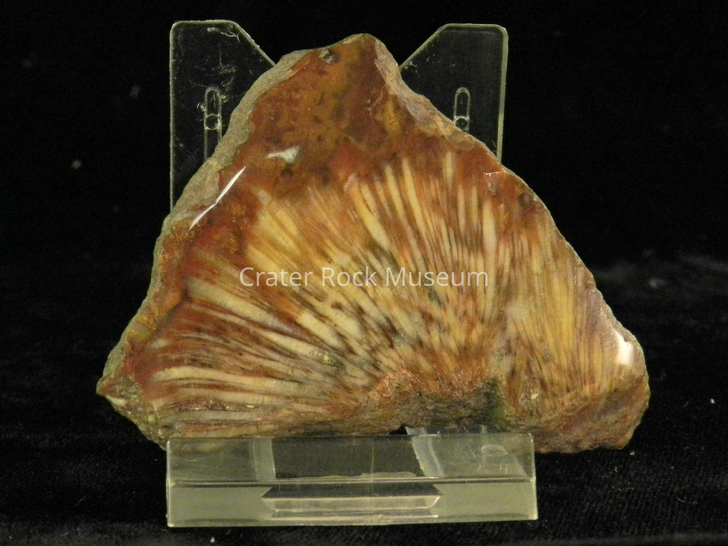 Description: Thin slab with polished face. Reddish-brown and orange outer areas with sprayed tan and dull yellows eminating from a common center.Collection