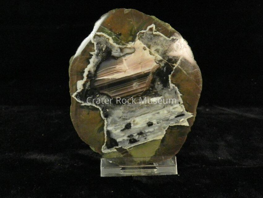 Description: Smooth, rounded back with polished face. Brown and tan outer regions with black, white, gray and pink bands in the center regions.Collection