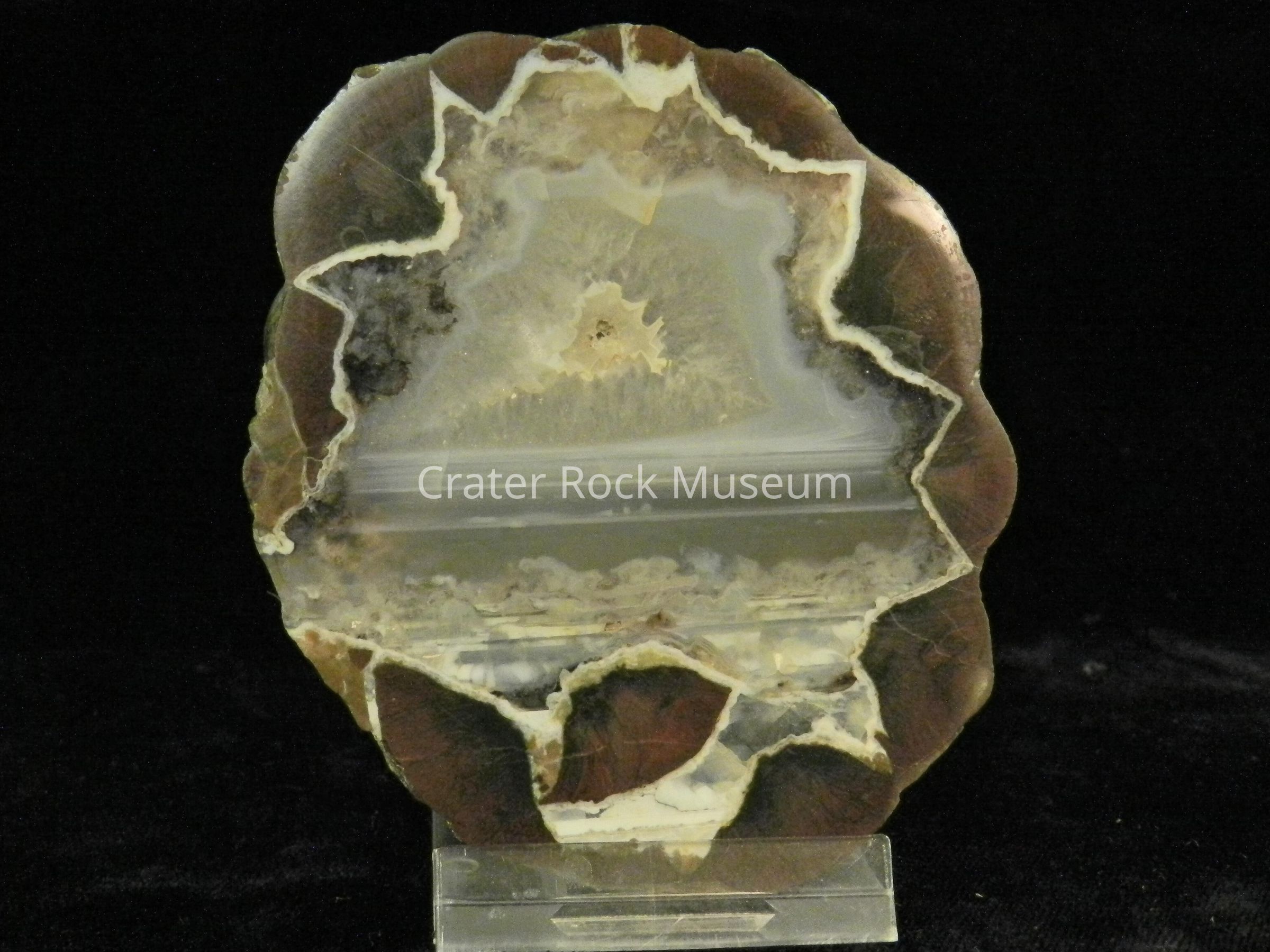 Description: Smooth, rounded back with polished face. Brown outer regions with translucent smokey gray, white and tan center region with slight banding and a crystalline structure in center area.