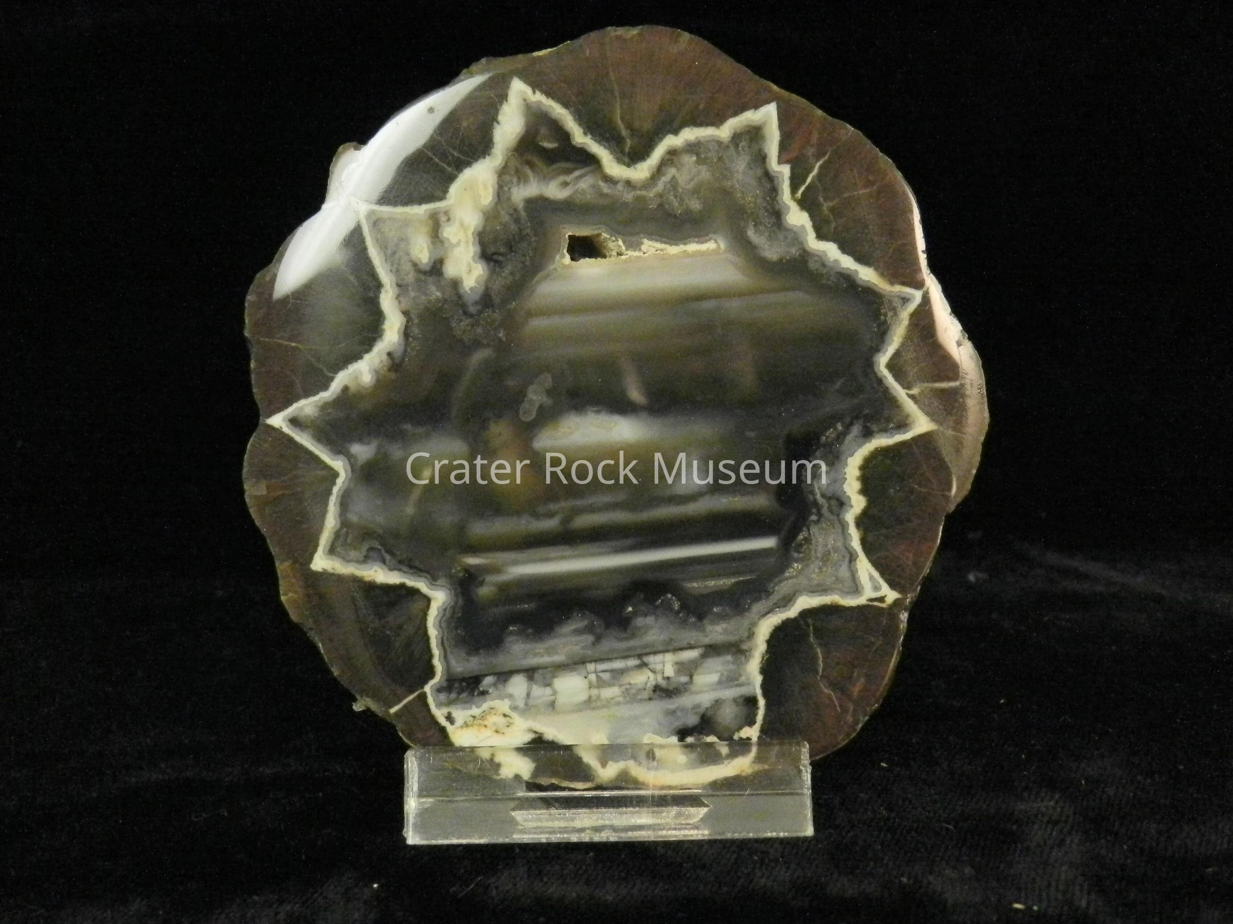 Description: Smooth, rounded back with polished face. Reddish-brown outer regions with translucent dark grays, black and white in a general banded structure in center.Collection