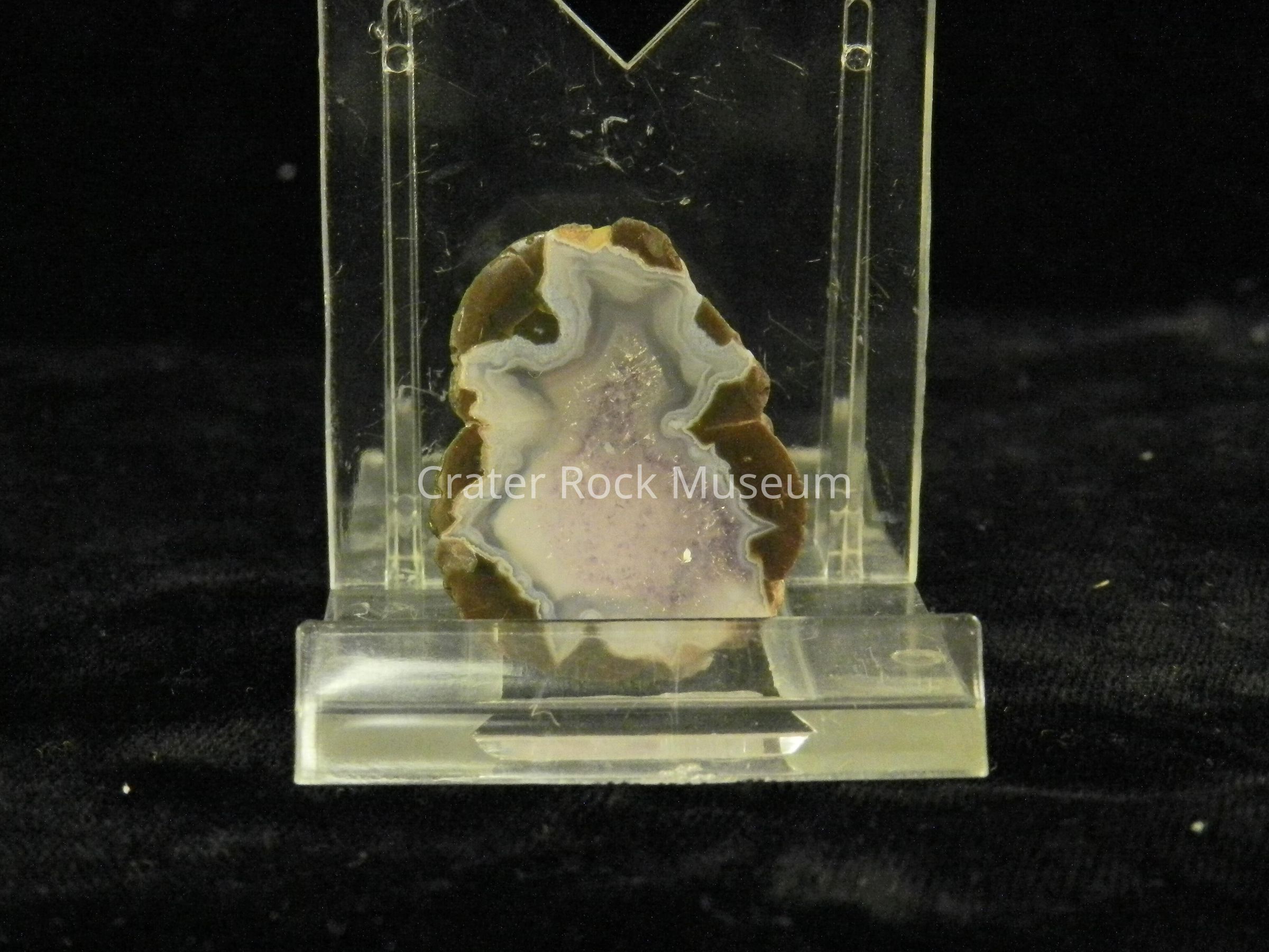 Description: Double thunderegg with smooth rounded back and polished face. Brown outer region with transparent banded blue-gray, white and a pink crystalline structure in the center region.Collection