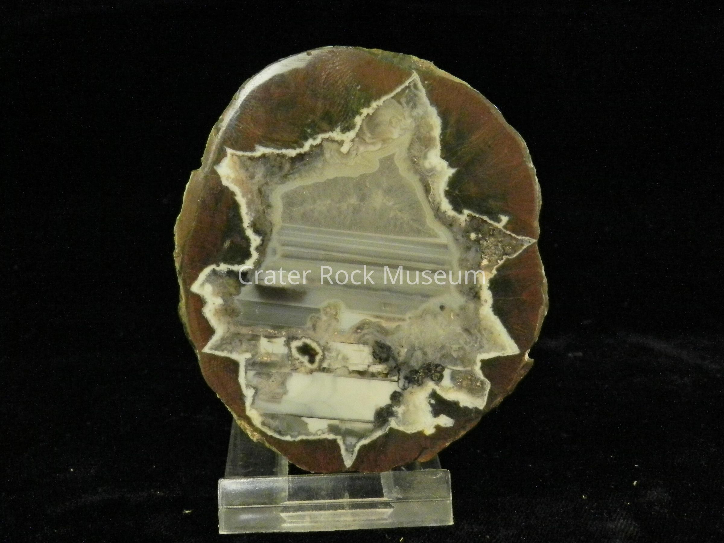 Description: Smooth, rounded back with polished face. Reddish-brown outer regions with a spotted black and beige inner area and banded smokey gray and tan center with an area of crystalline structure.Collection