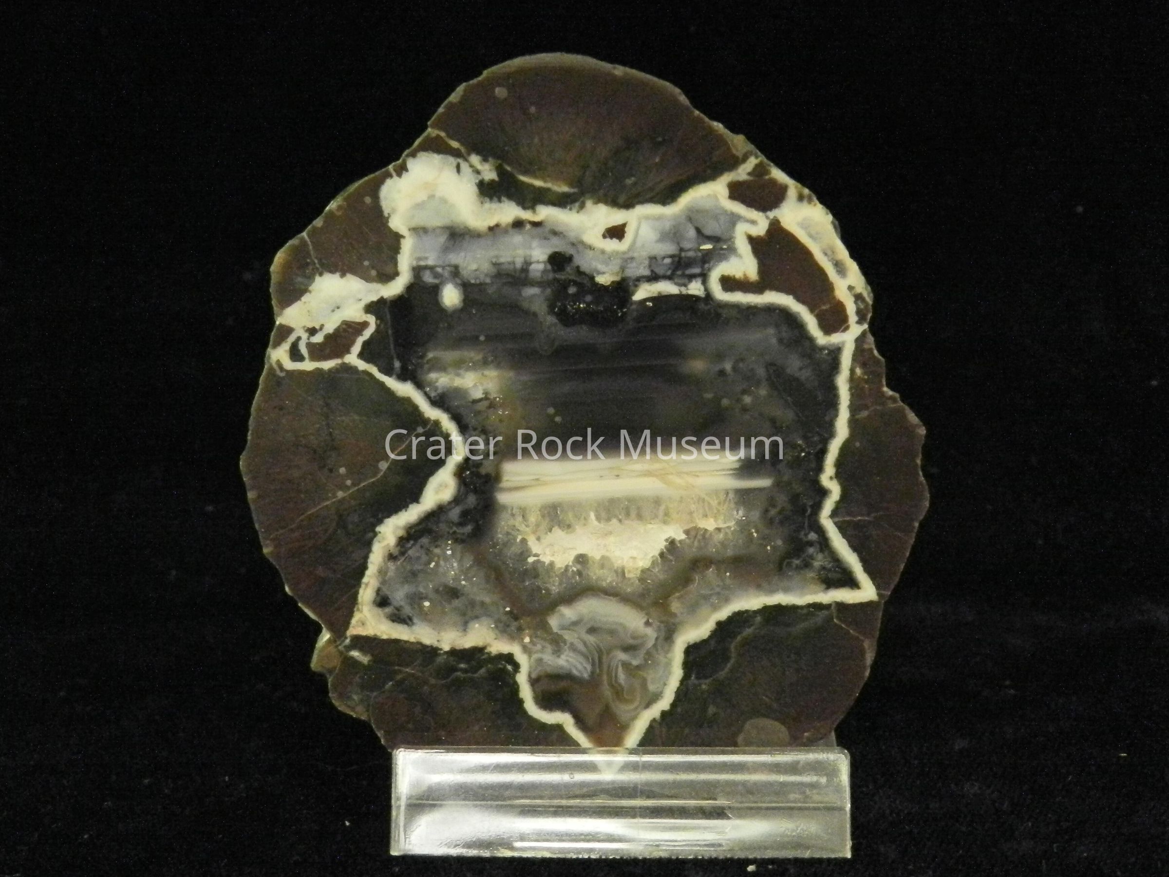 Description: Smooth, rounded back with polished face. Dark brown outer regions with white bands surrounding a black and dark gray center with slight white bands.