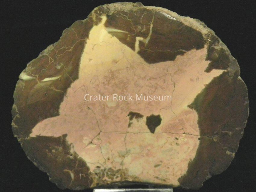 Description: Rough, rounded back with polished convex face. Light reddish-brown outer areas with a pink and beige inner area.Collection