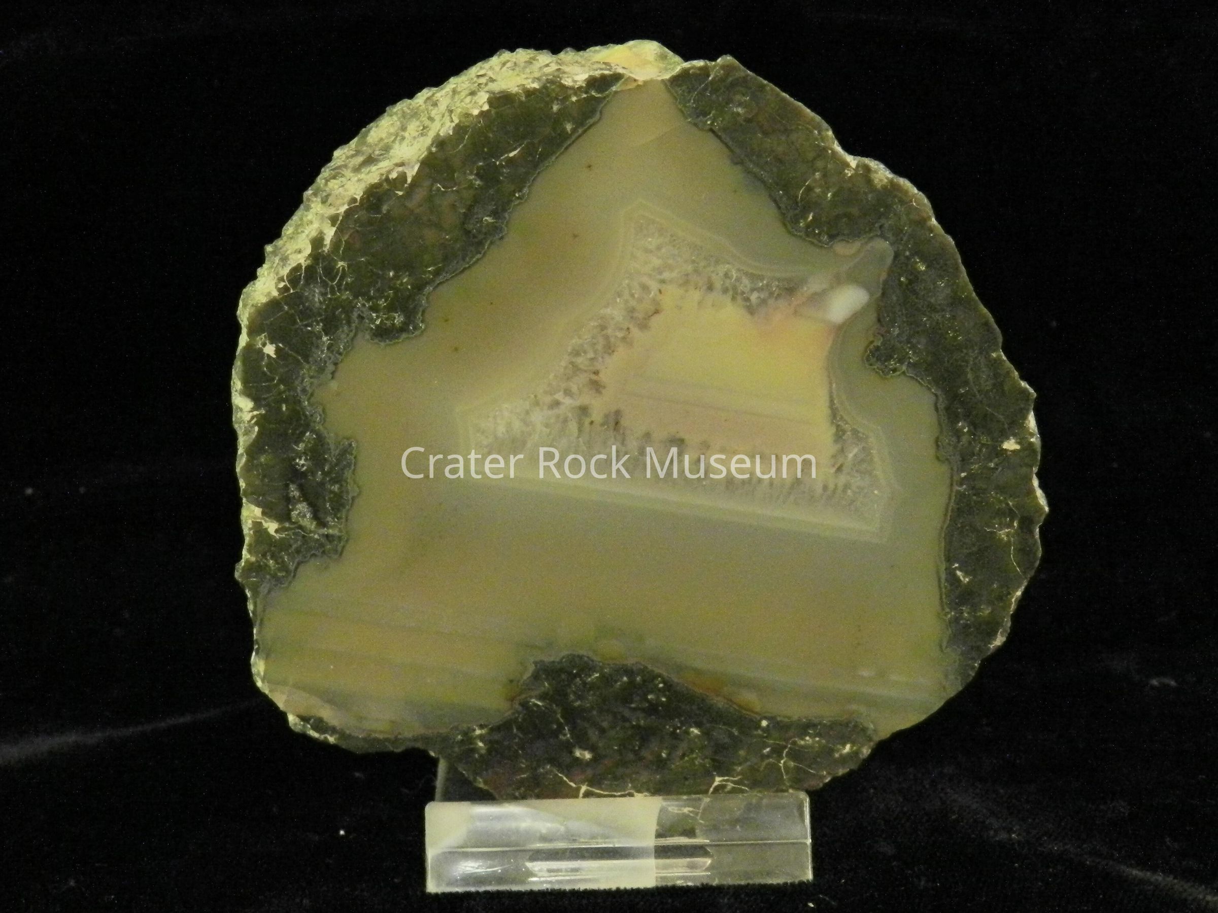Description: Rough, rounded back with polished face. Dark olive green on outer regions with creamy yellow on inner area and a small area of banded white and pinkish beige towards center.Collection