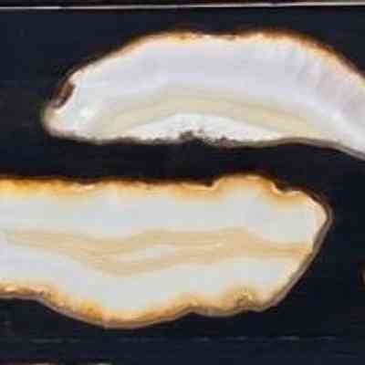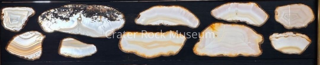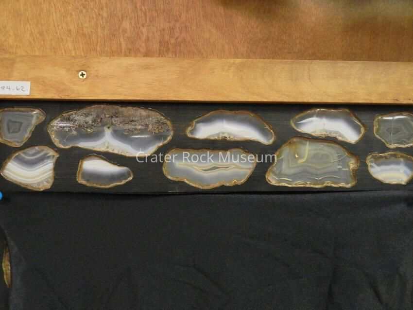 Description: Panel with (ten) specimens. Thin, large slabs with polished faces. various translucent colors that are backlit.Collection