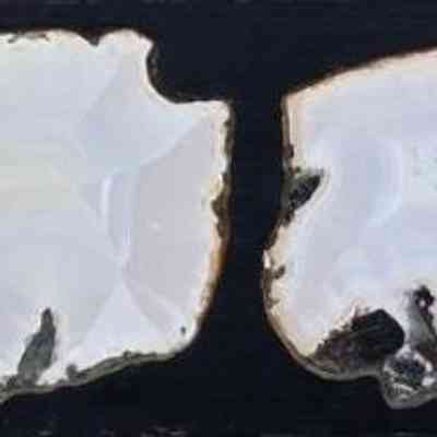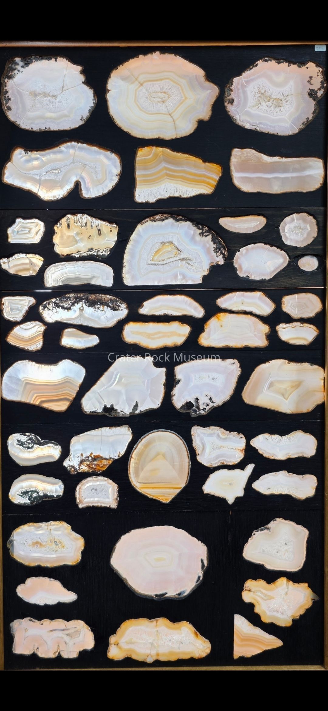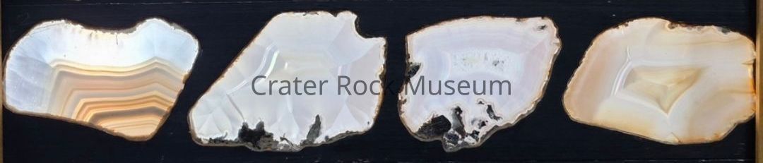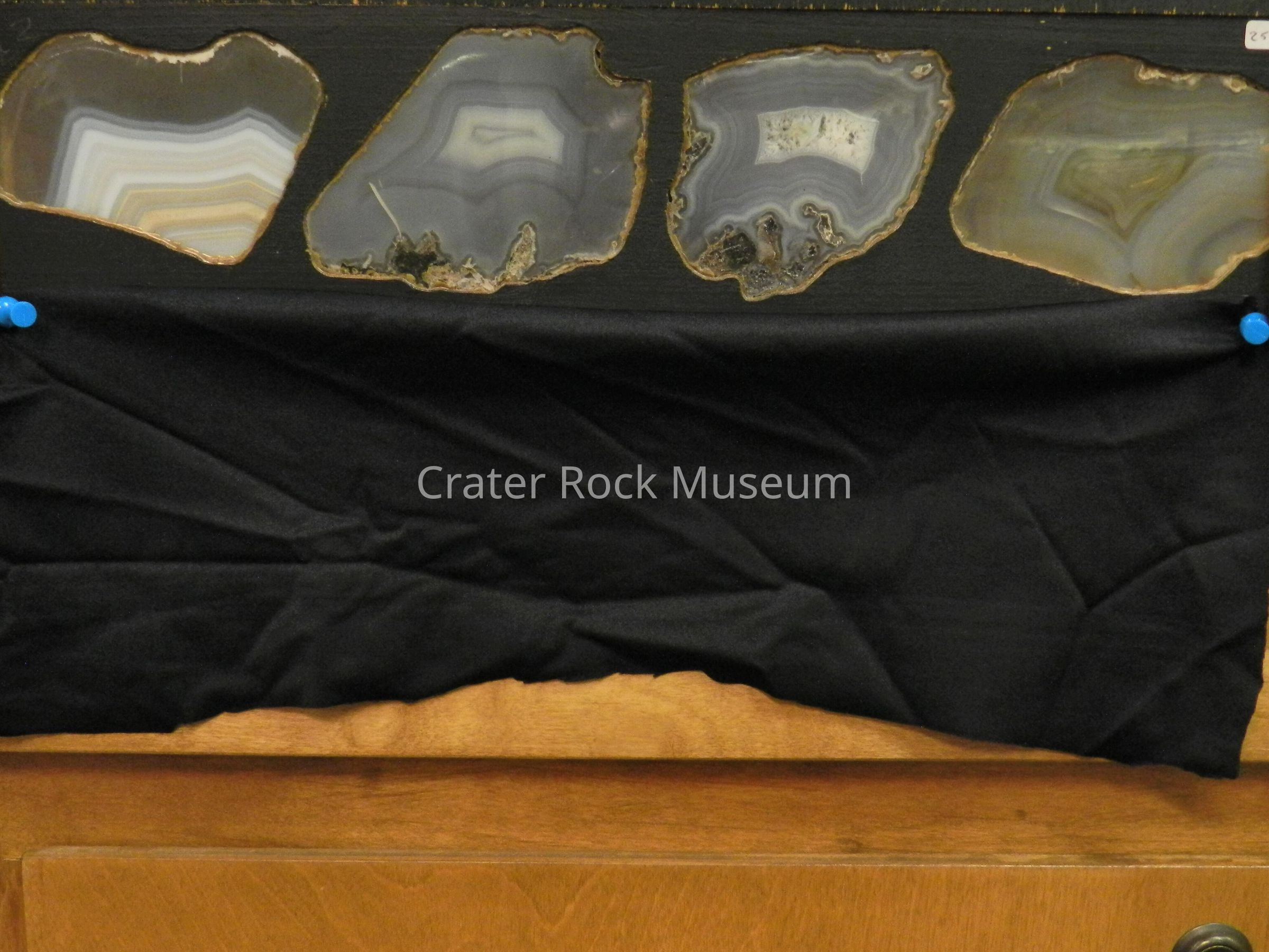 Description: Panel with (four) specimens. Thin, large slabs with polished faces. various translucent colors that are backlit.Collection
