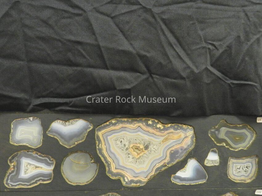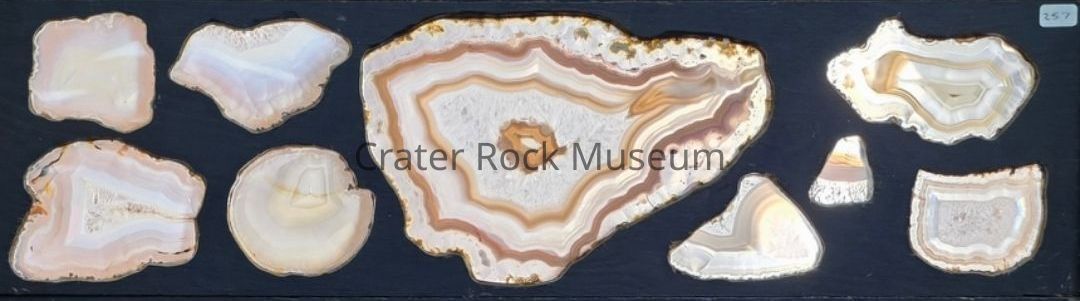 Description: Panel with (nine) specimens. Thin slabs with polished faces. Various translucent colors, backlit.Collection