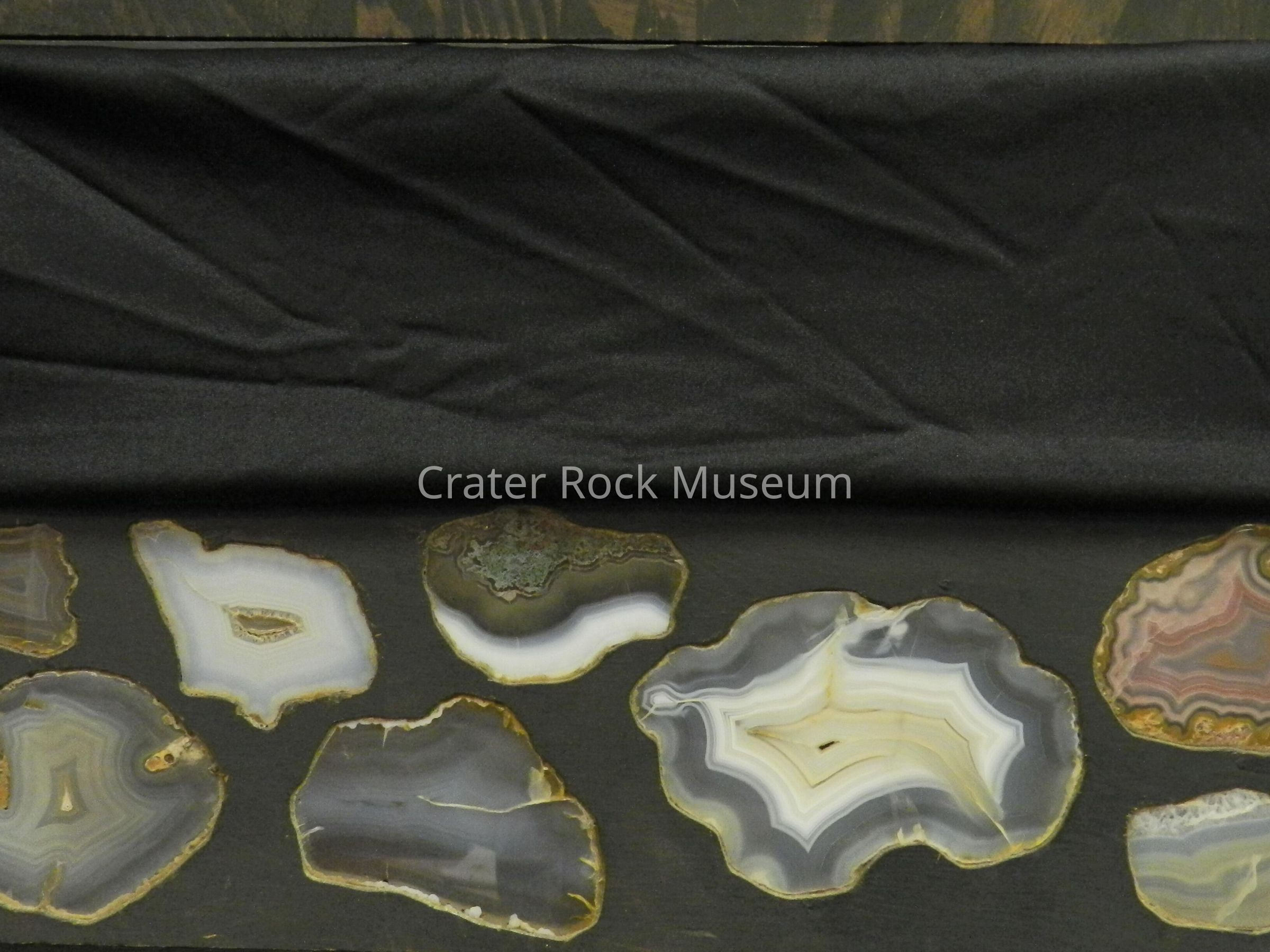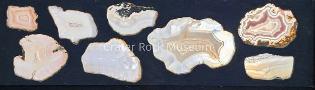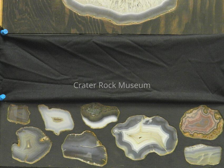Description: Panel with (eight) specimens. Thin slabs with polished faces. Various translucent colors, backlit.Collection
