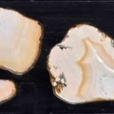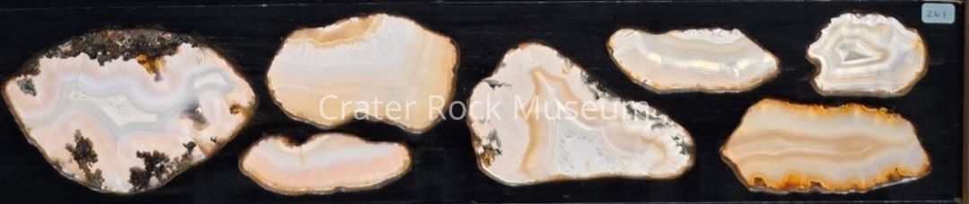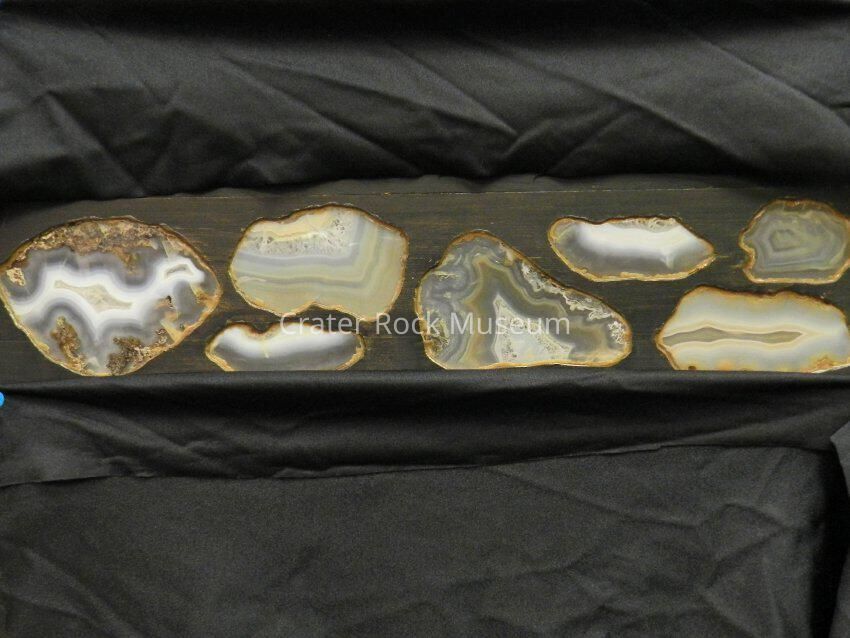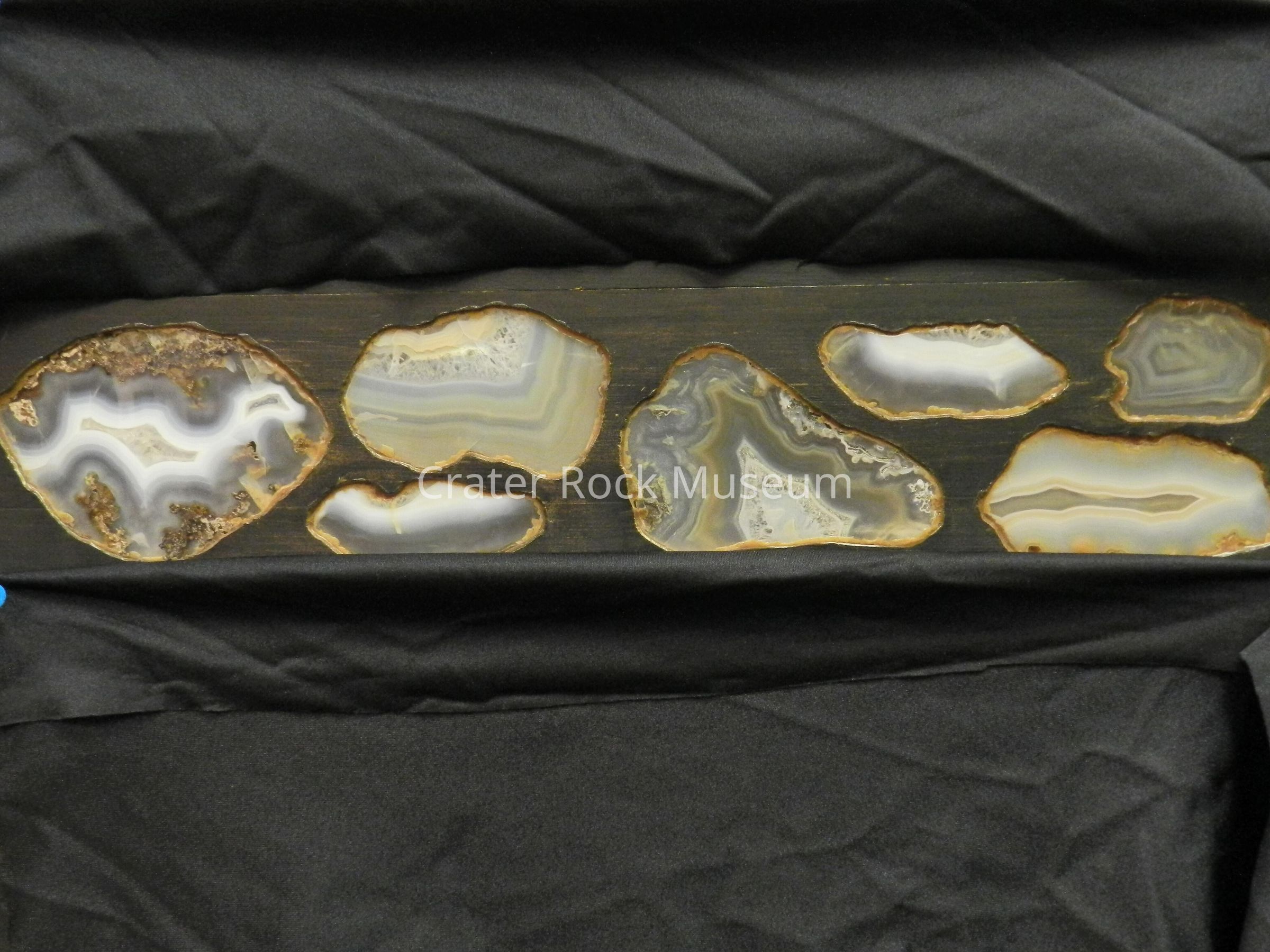 Description: Panel with (seven) specimens. Thin slabs with polished faces. Various translucent colors, backlit.Collection