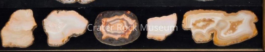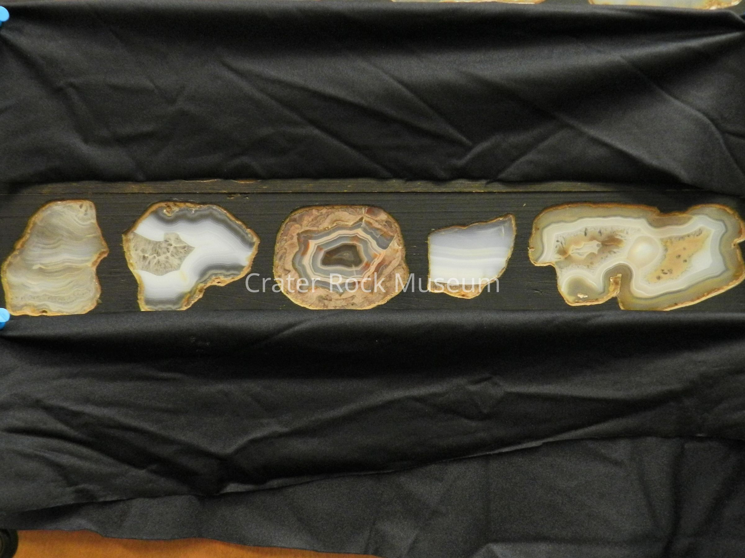 Description: Panel with (five) specimens. Thin slabs with polished faces. Various translucent colors, backlit.Collection