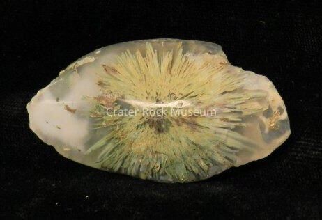 Description: Rough, rounded back with polished convex face. Elongated, oval, transparent clear and creamy white with light and dark lime-green splaying.