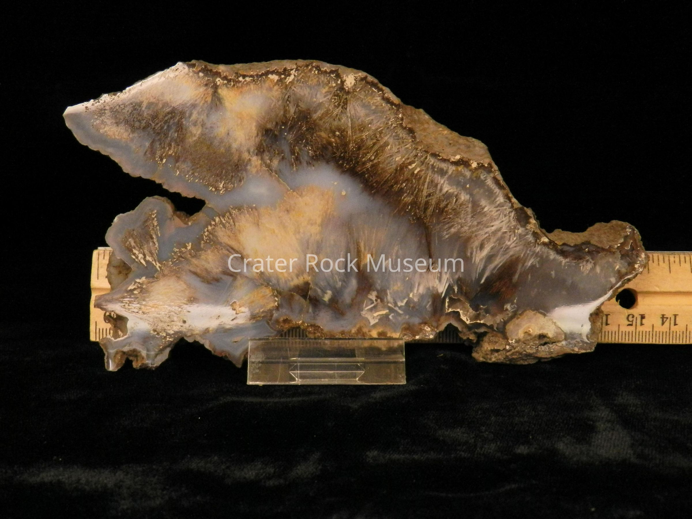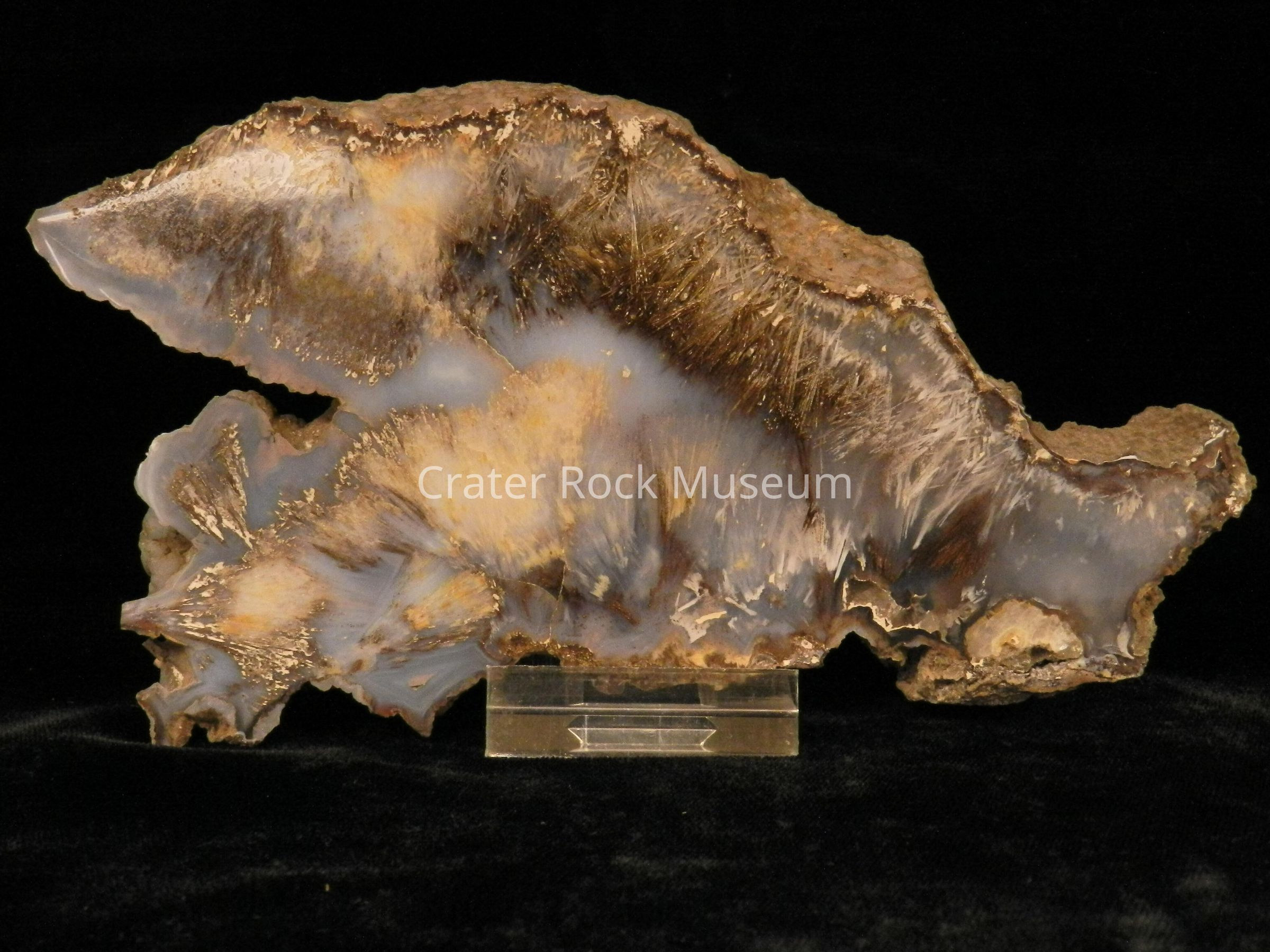 Description: Thin slice with polished face. Translucent blue-gray and brown with beige and brown splaying throughout.