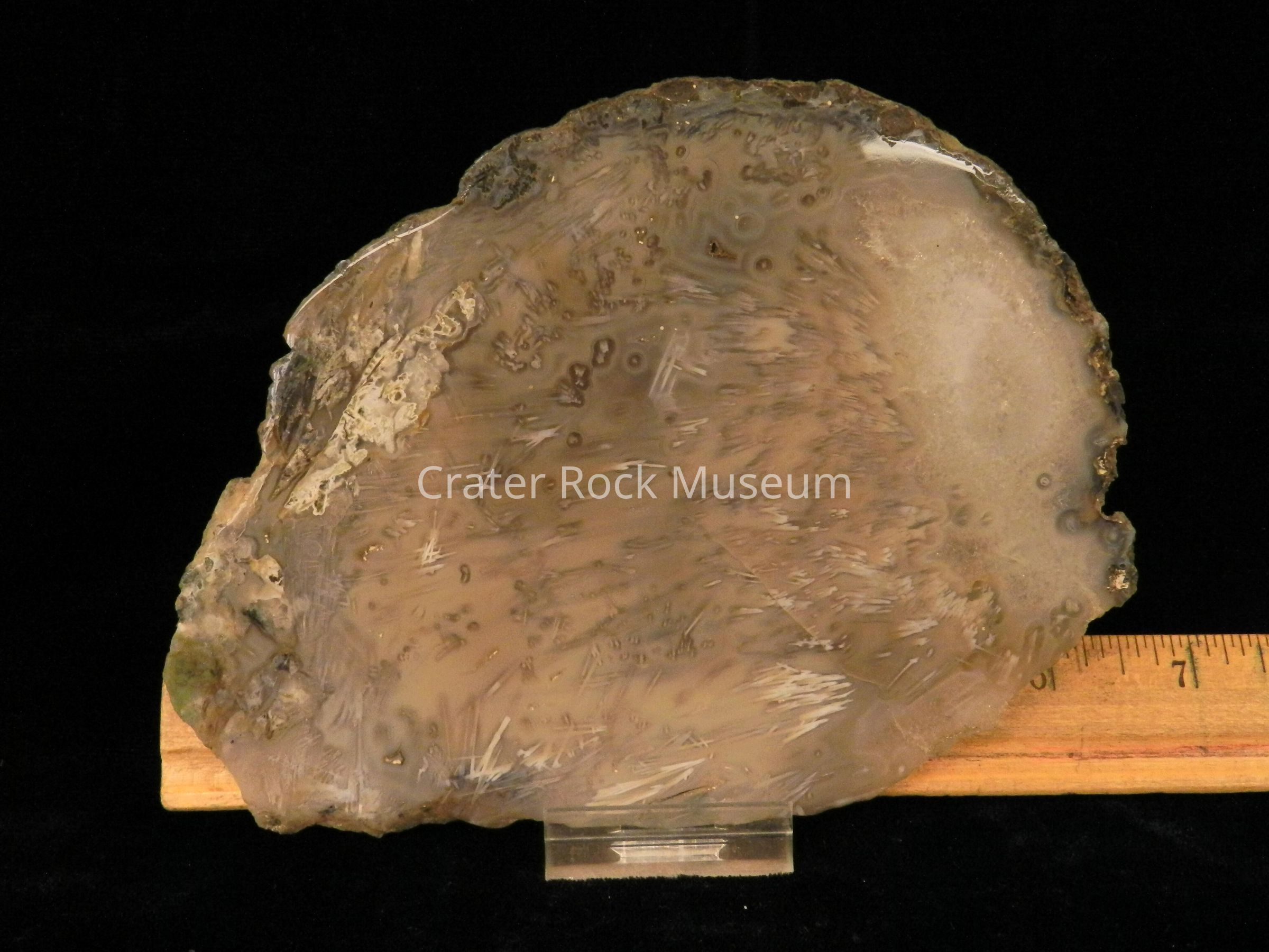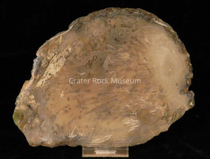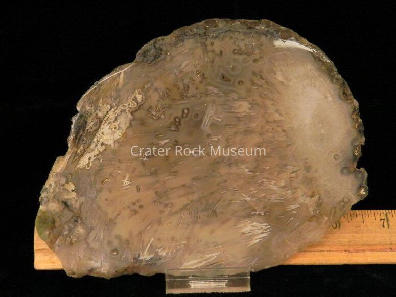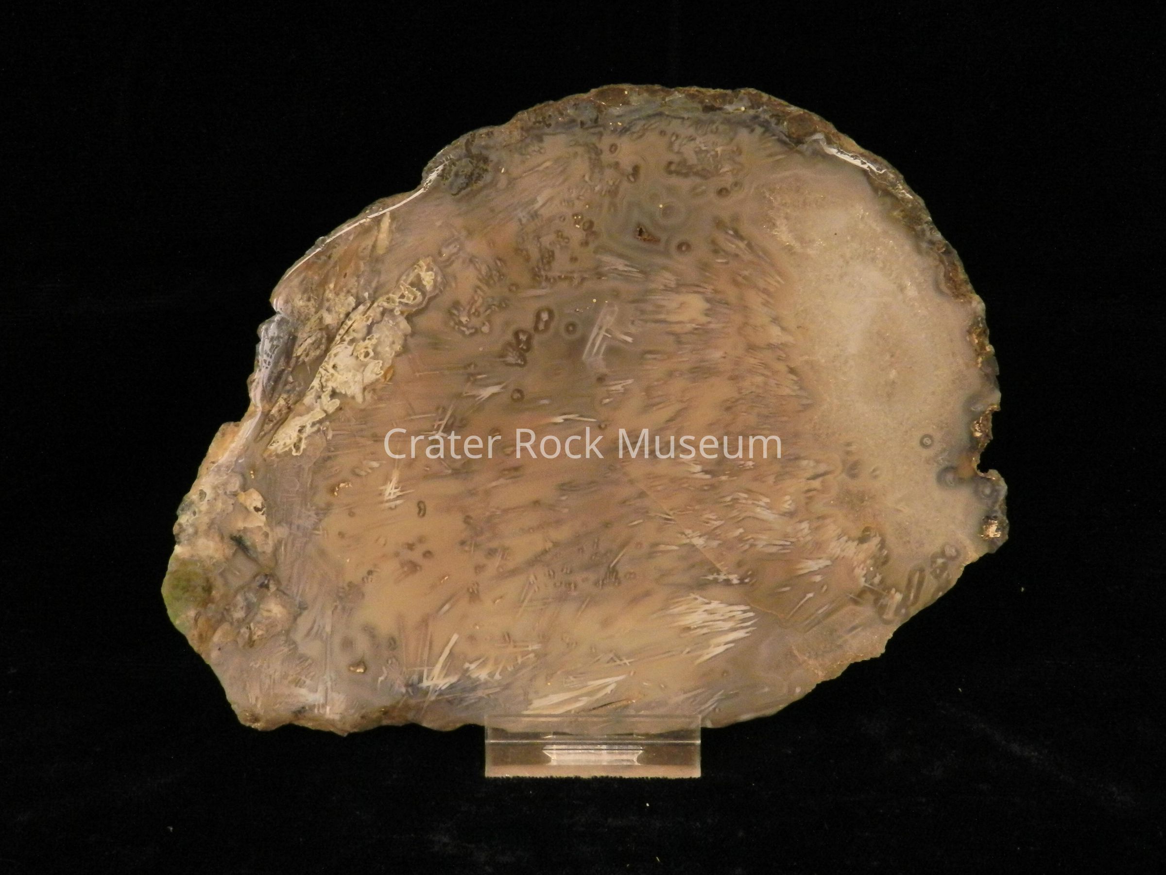 Description: Thin slice with polished face. Translucent creamy beige with one area of lighter creamy tan and white. Slight brown and white splaying throughout.