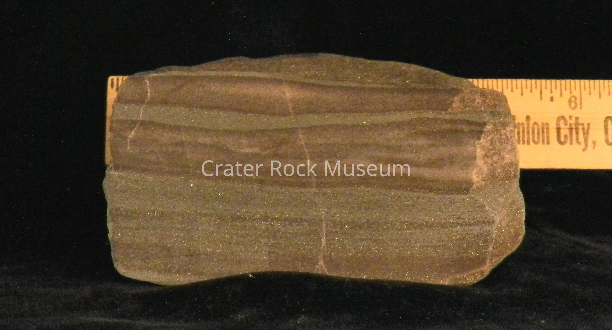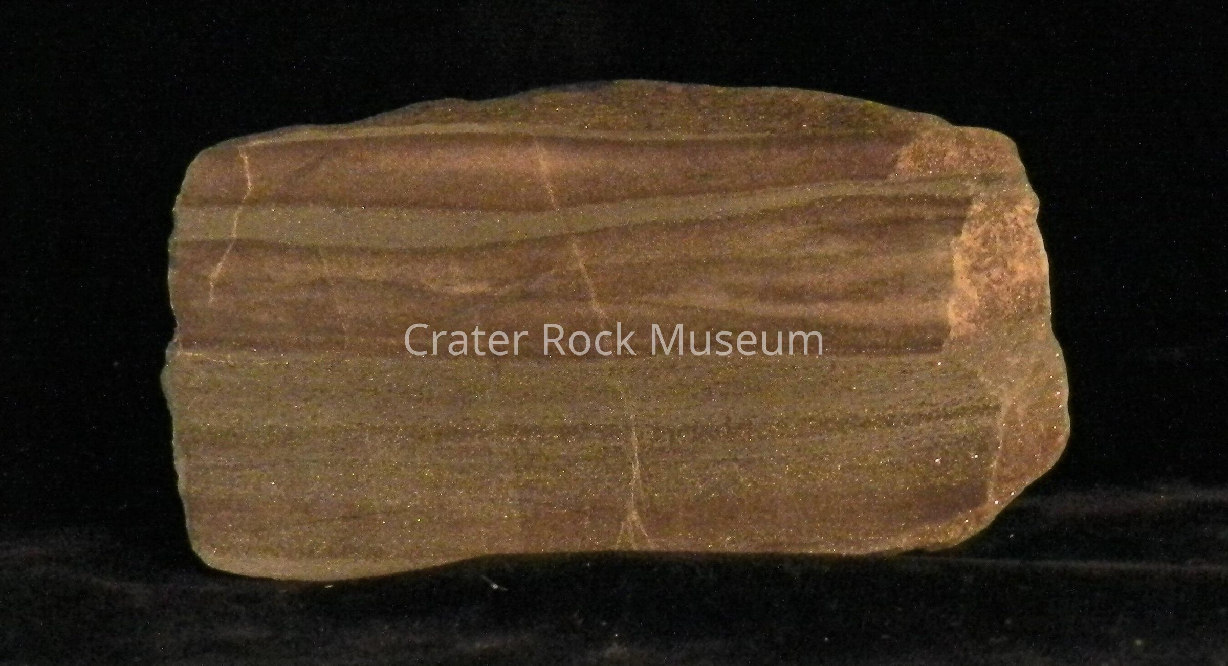 Description: Semi-rectangular block with one beveled polished face. Banding is apparent with layers of metallic lustered bands, and light and dark lavender bands.