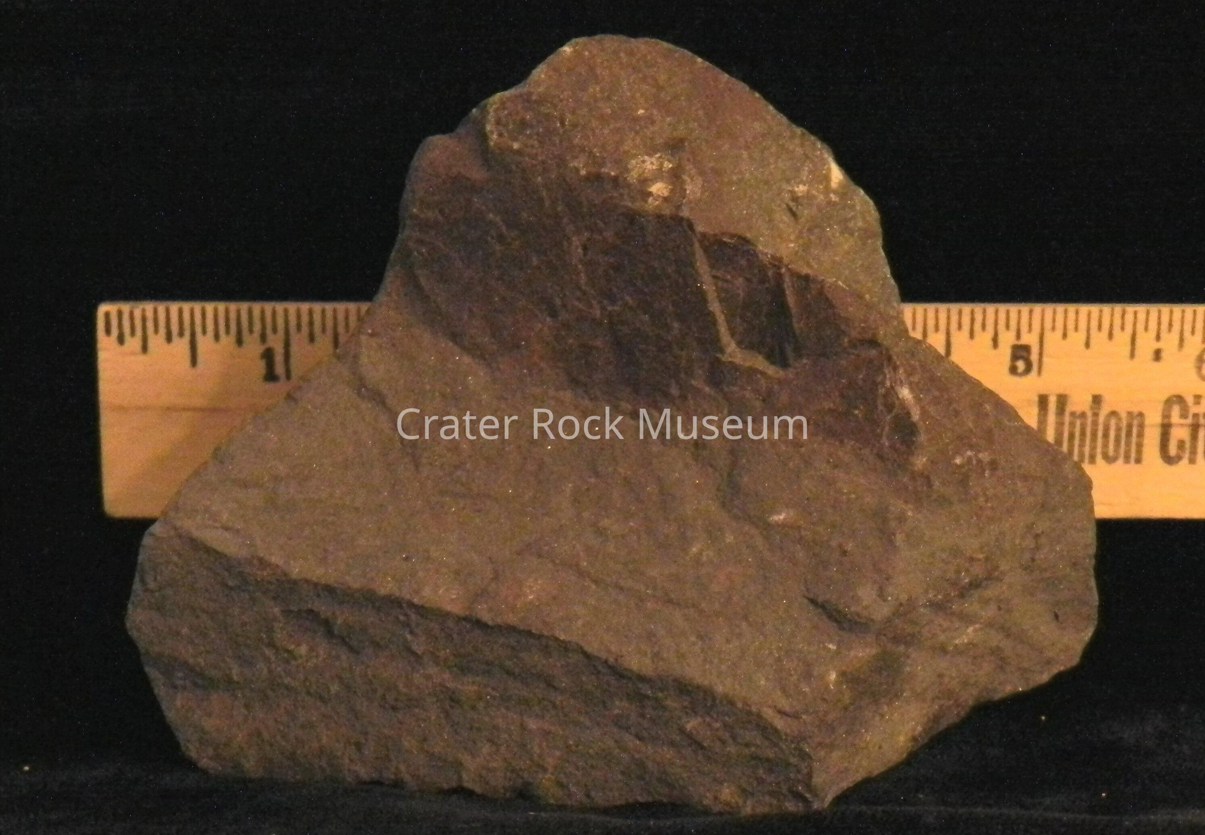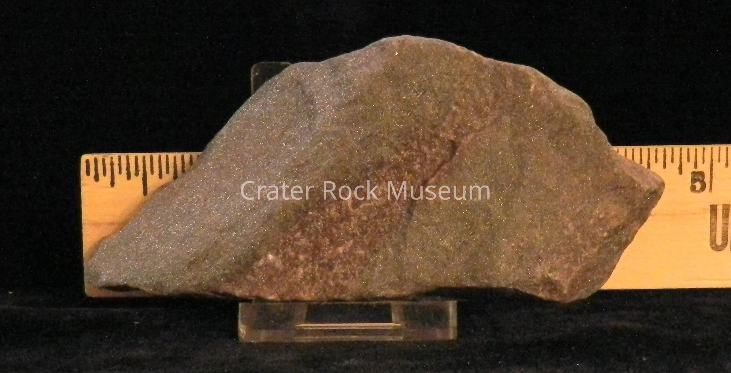 Description: Angular block with several sides, one thick band runs through specimen which is a dark magenta while the remaining areas are dark gray. Some metallic luster. (very small specks).
