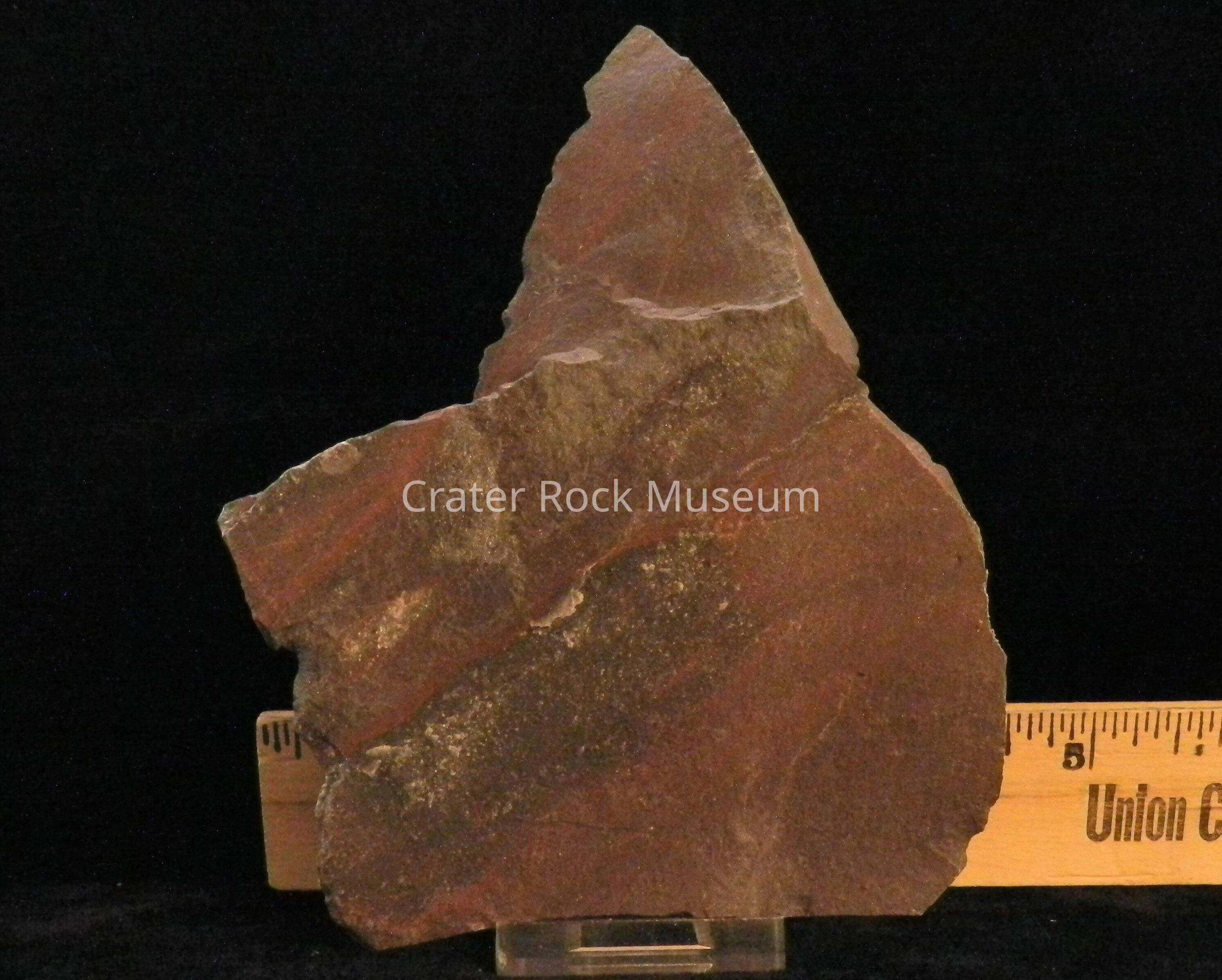 Description:Flat, angular slab with banding and slight metallic luster. Color is dark gray to reddish-brown. (bands).