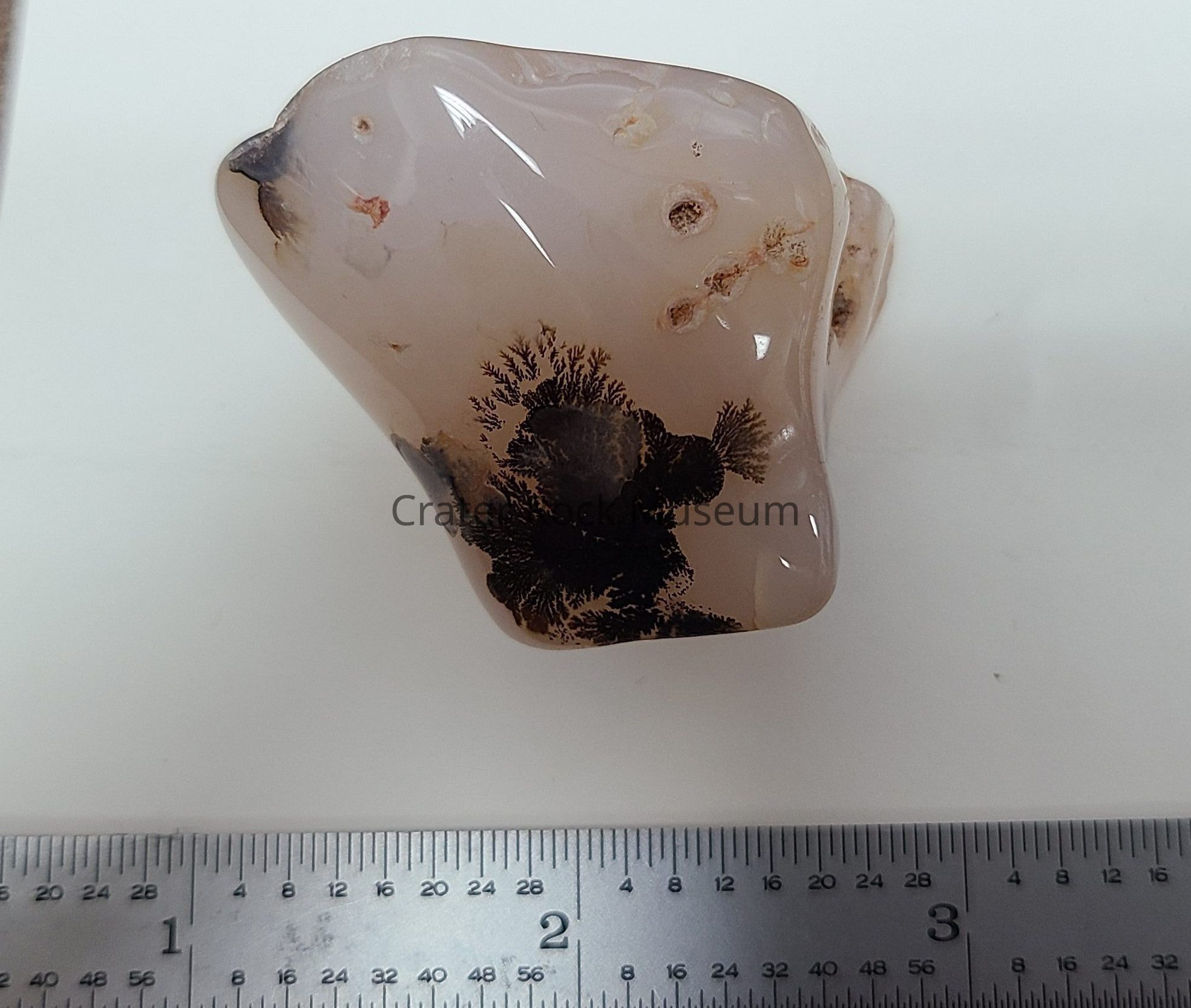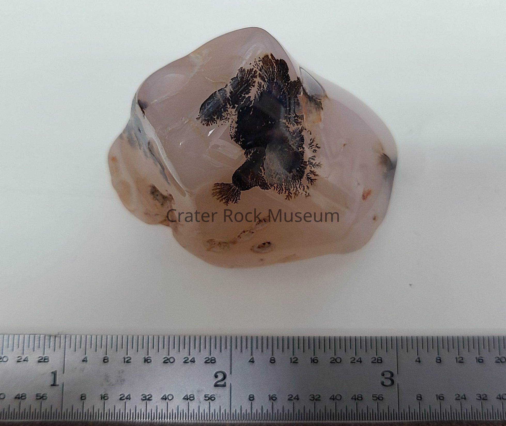 [A] pinkish polished nodule with black dendritic sprays and some orange tinting