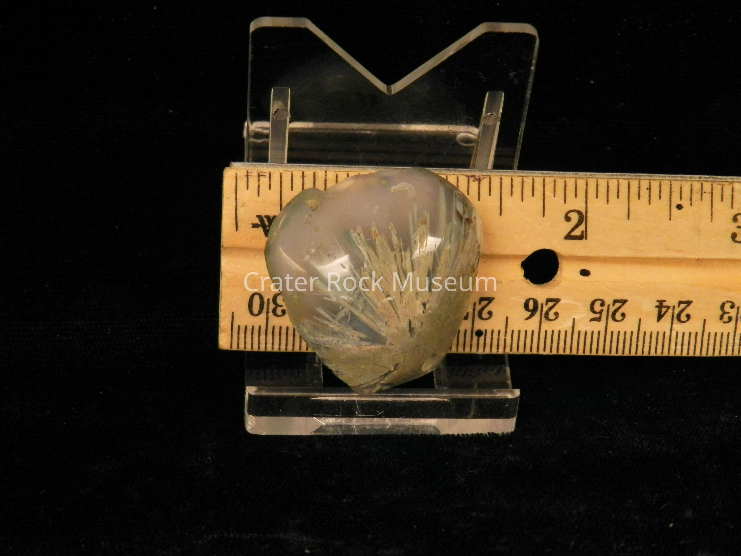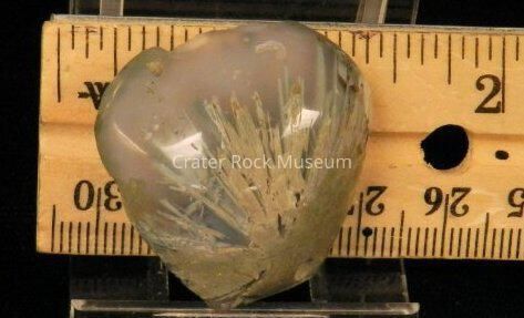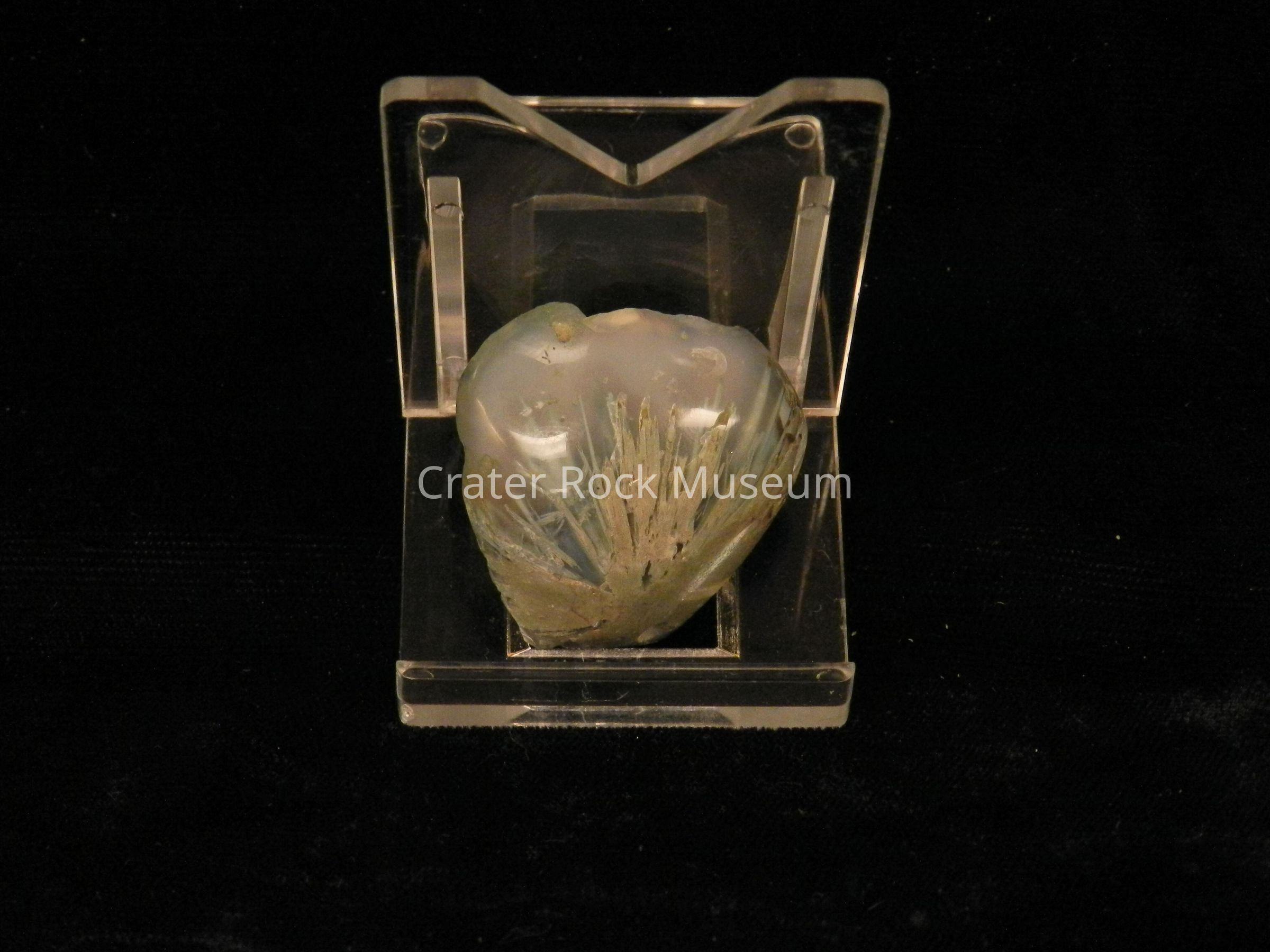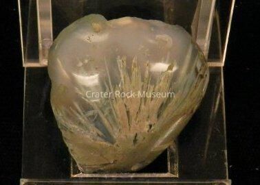 Description: Rounded, pock-marked back with convex polished face. Transparent blue-gray with lime-green splaying.