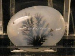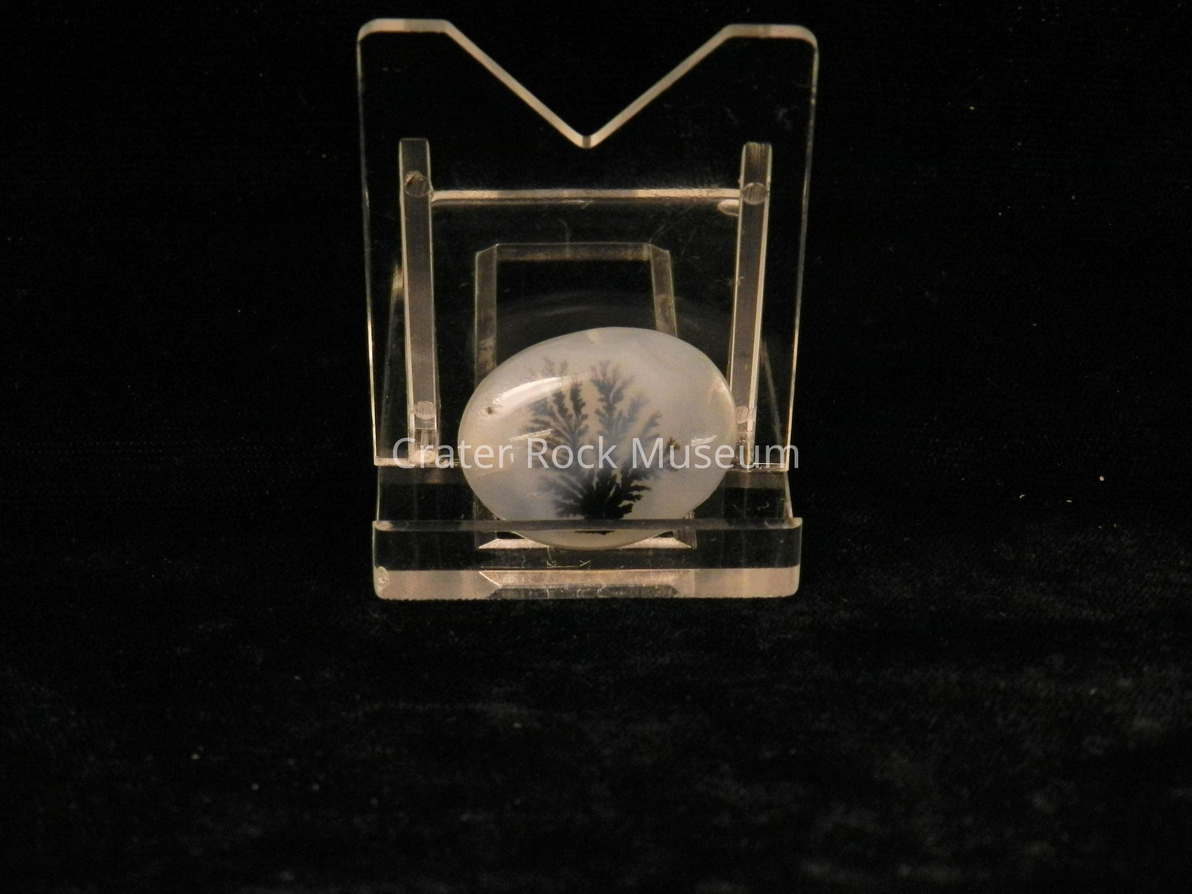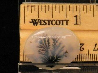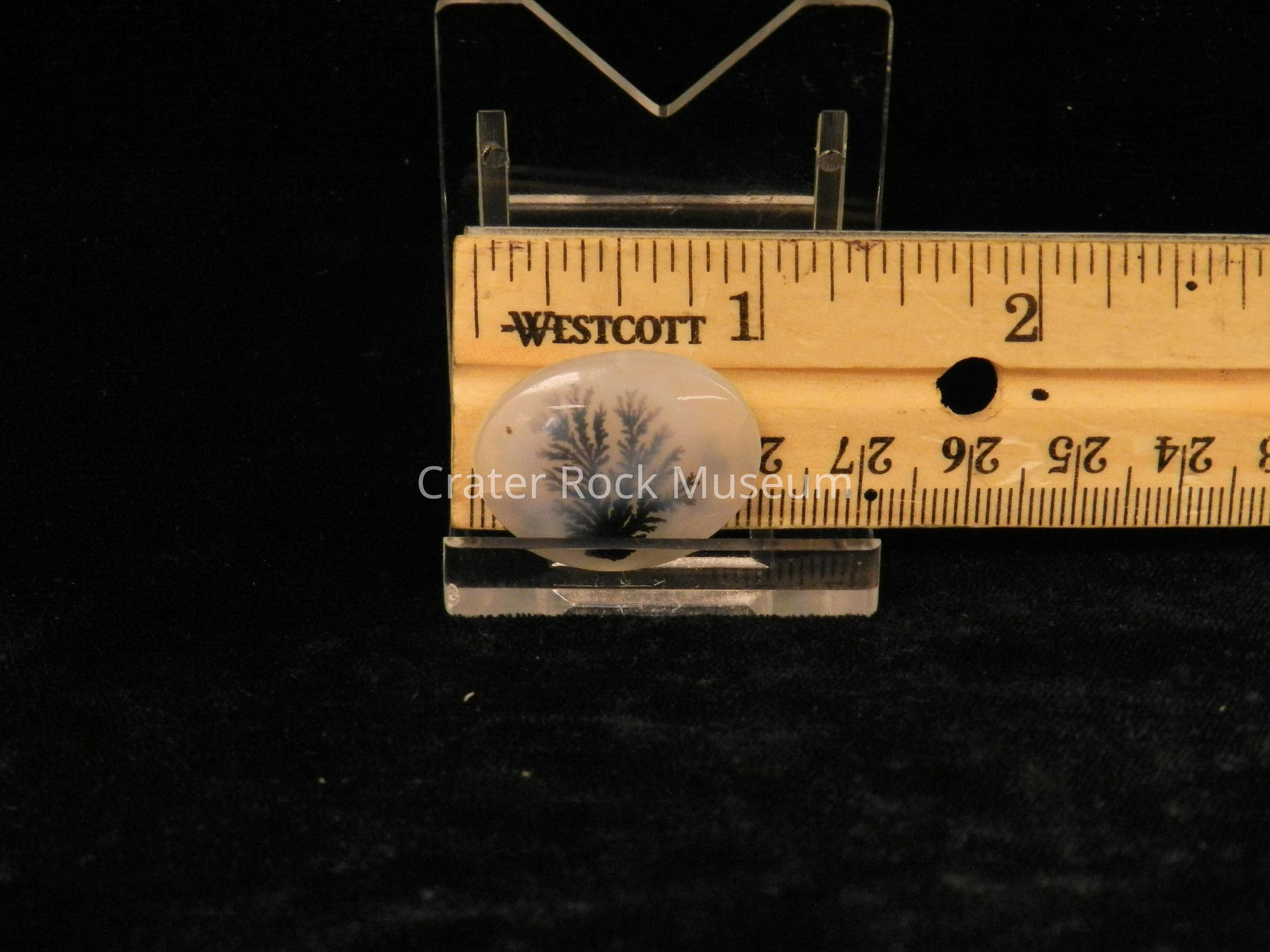 Description: Small oval with convex polished face. Transparent blue-gray with one black dendritic structure in center.