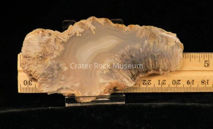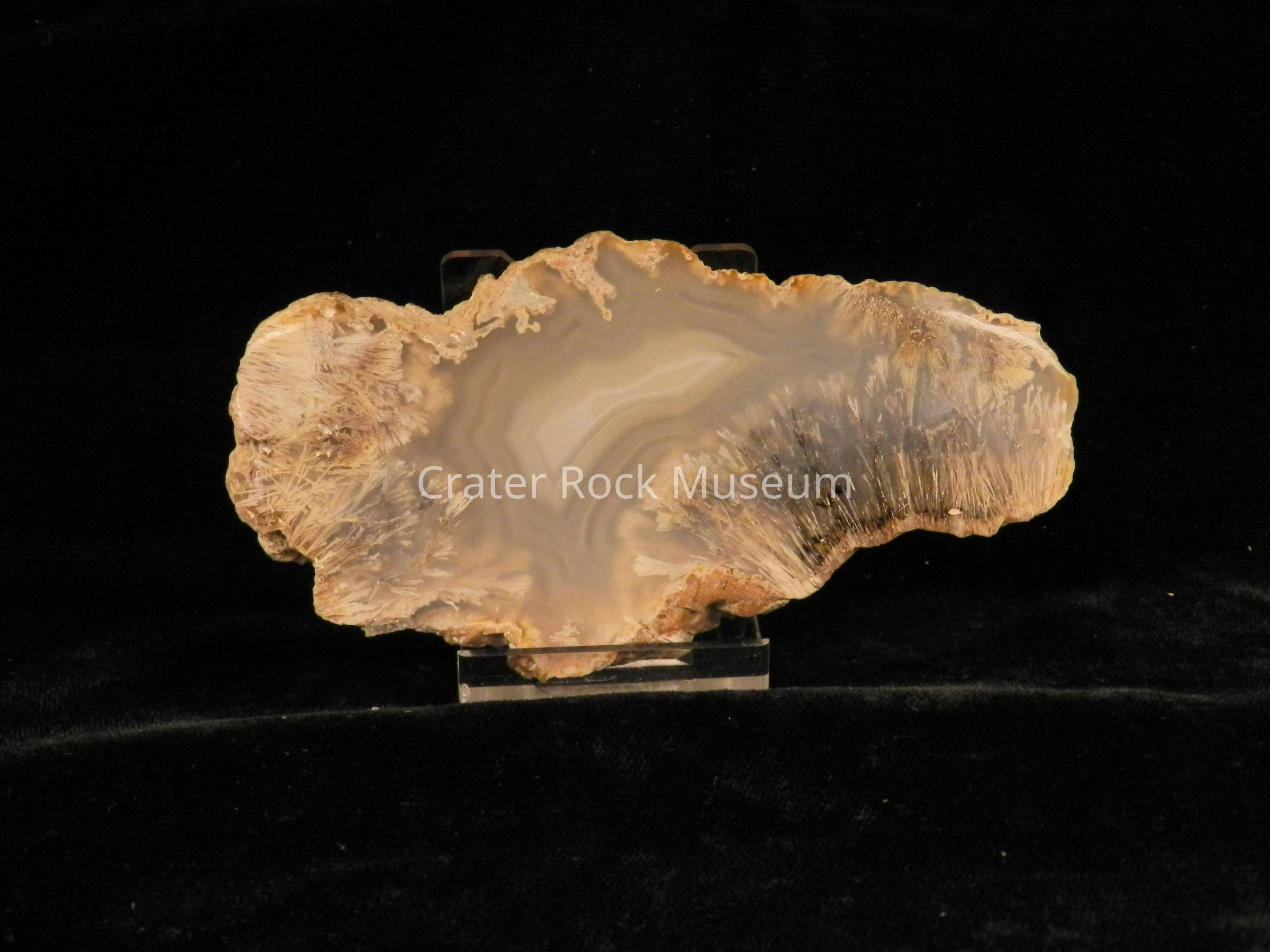 Description: Thin, beveled slice with flat back and polished face. Translucent, slightly banded creamy tan in center with beige and black splaying on outer regions.