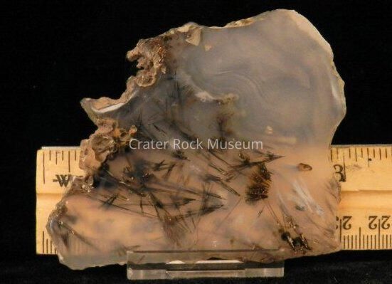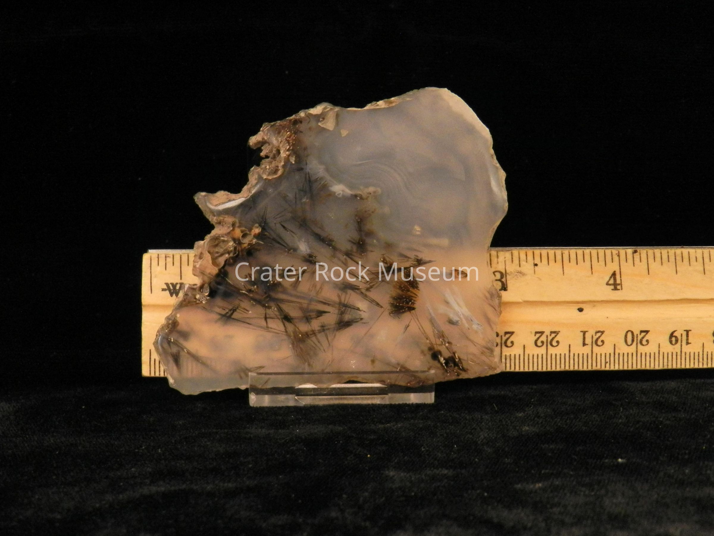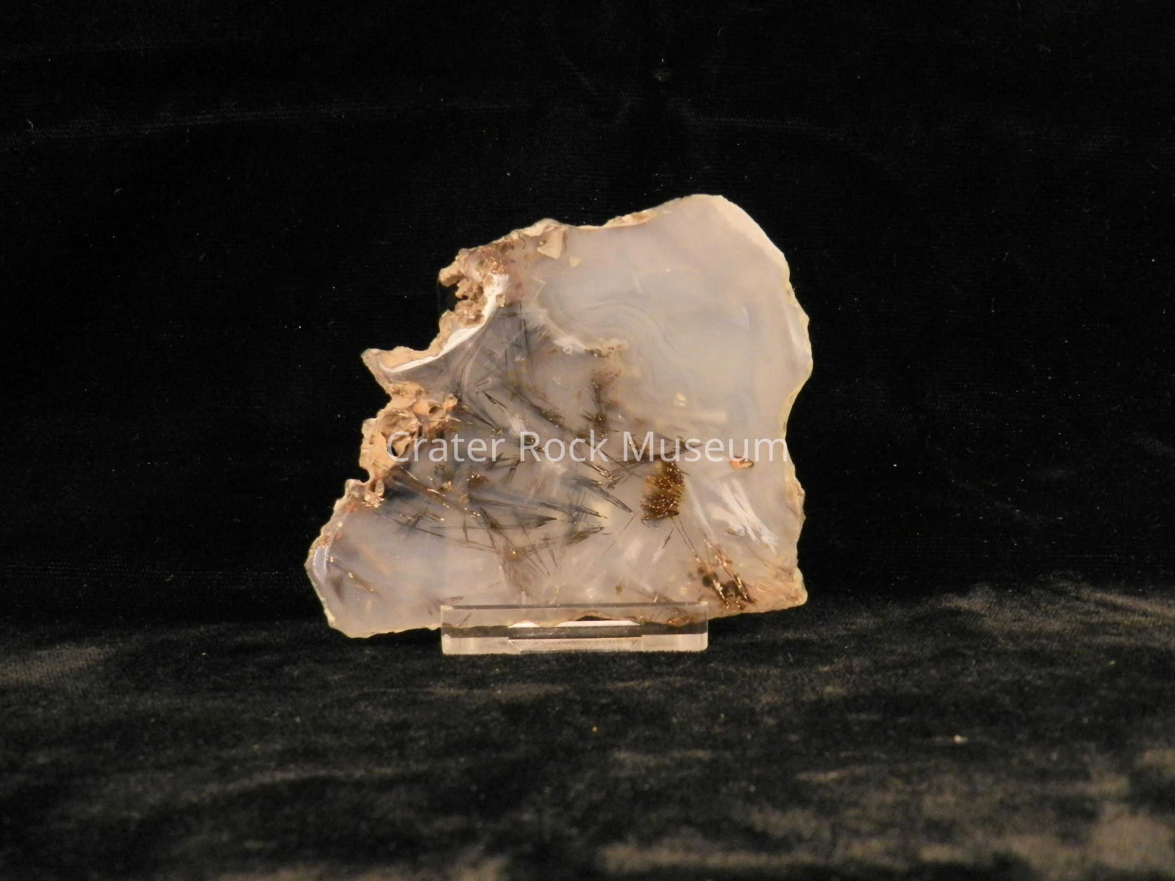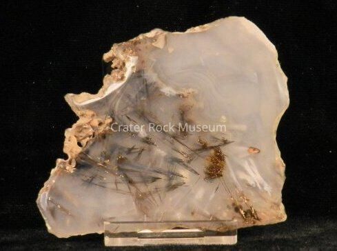 Description: Thin slice with polished face. Transparent creamy tan with slivers of black throughout.