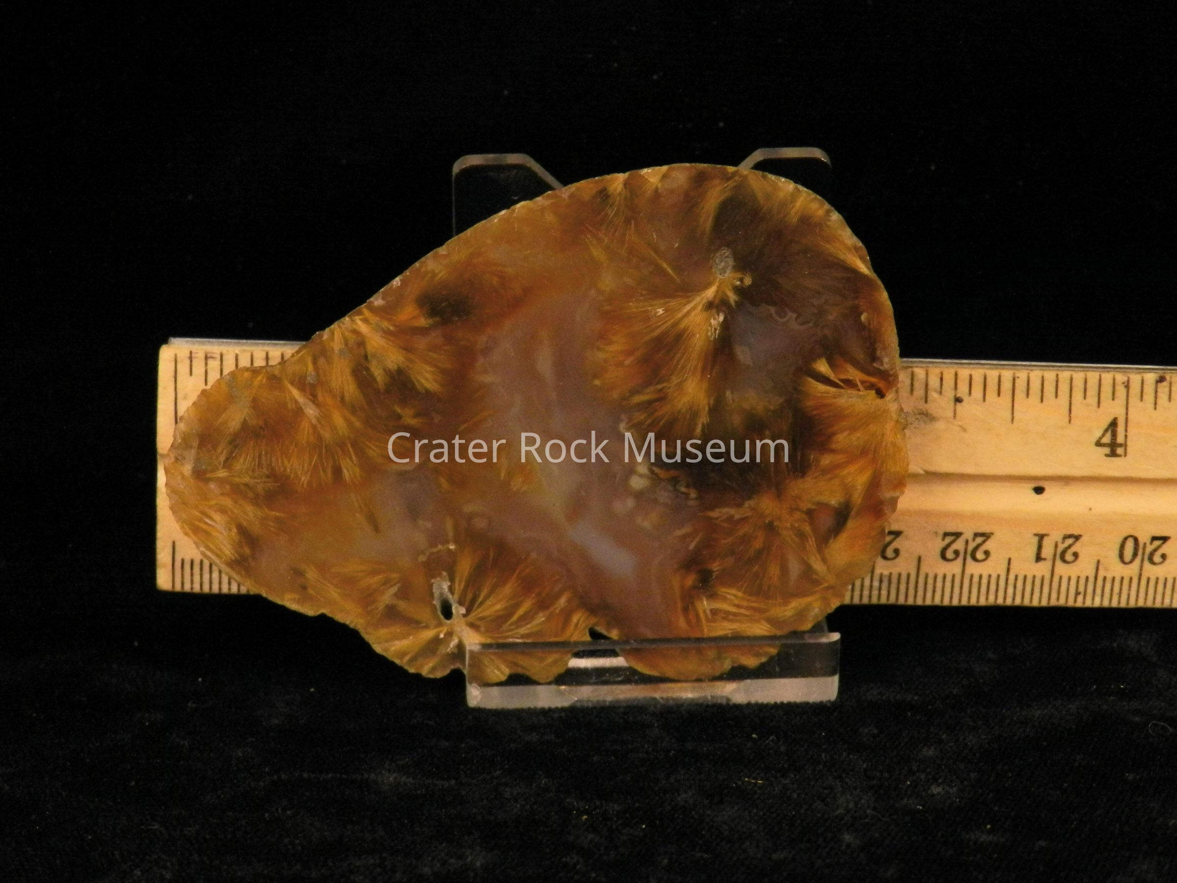 Description: Smooth, rounded back with polished face. Translucent reddish-brown and tan. Hair-like "flowers" surrounding a common center.