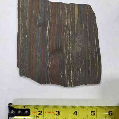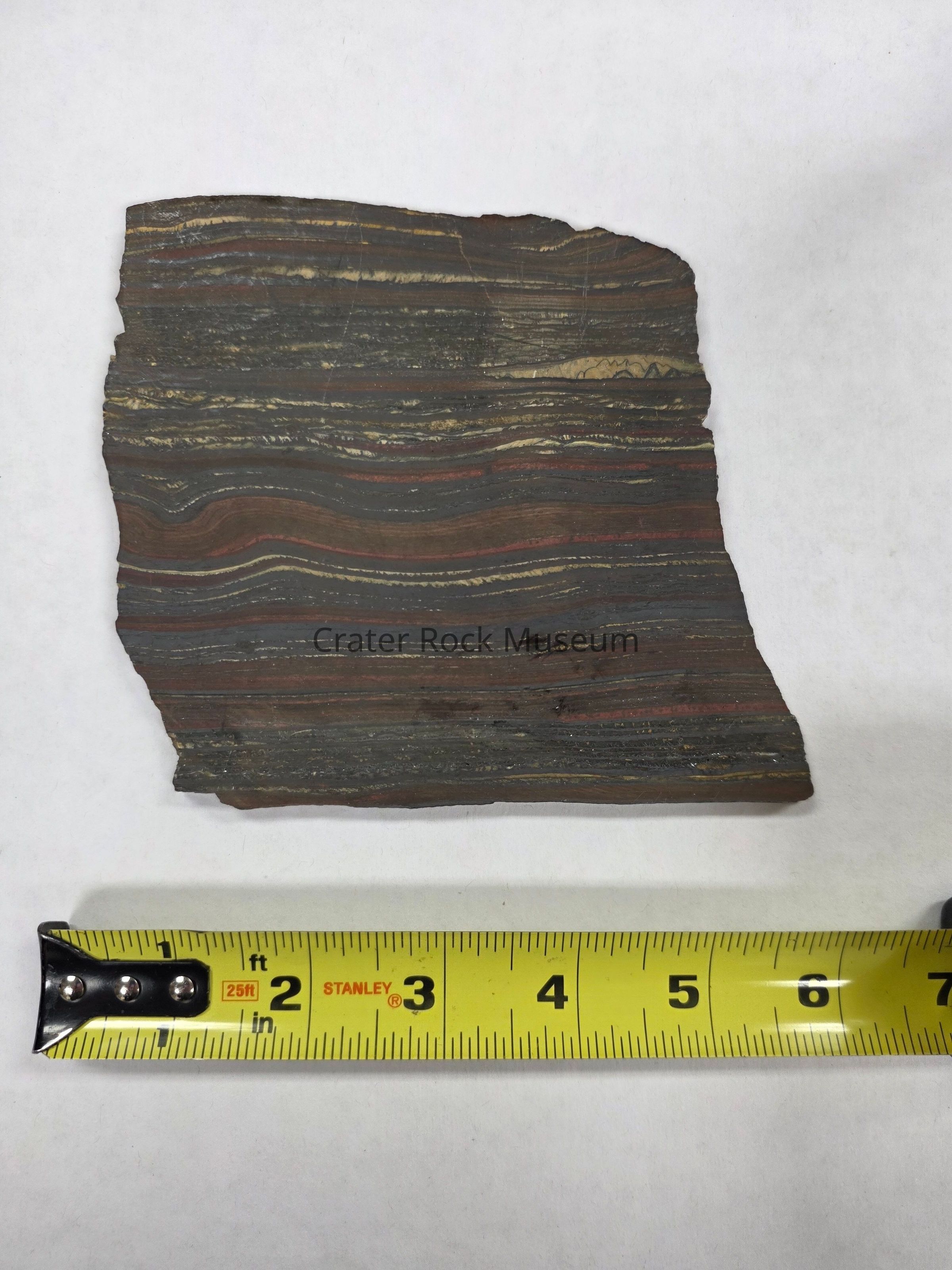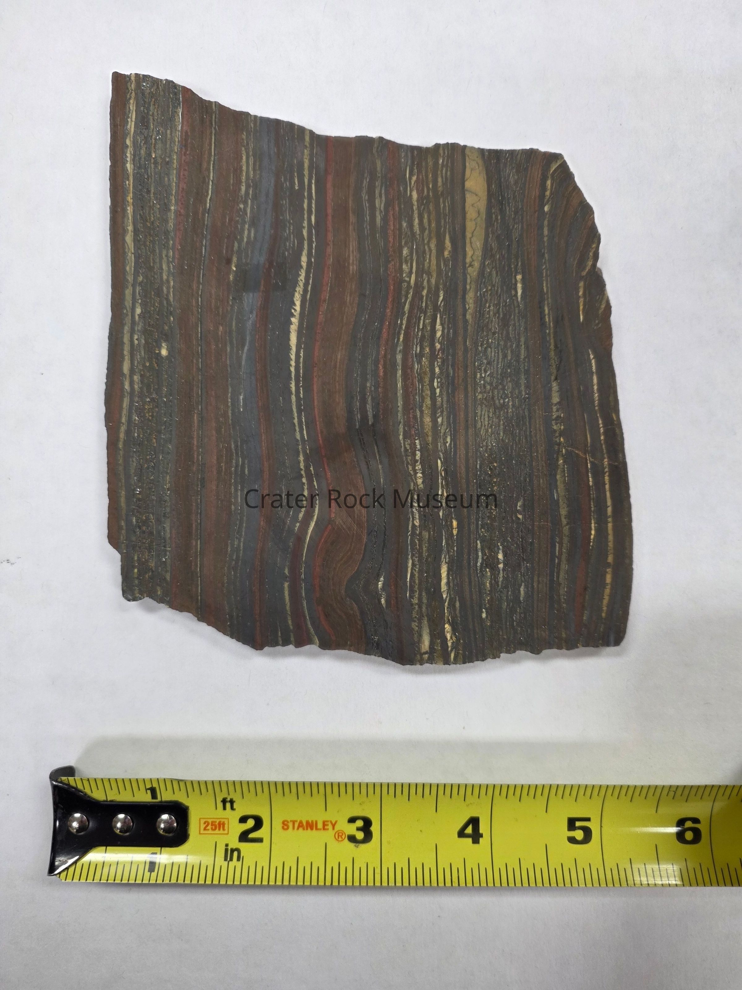Roughly square slice of unpolished material. Alternating stripes of red (jasper) and reflective grey (hematite) with some light brown (tiger eye) throughout.