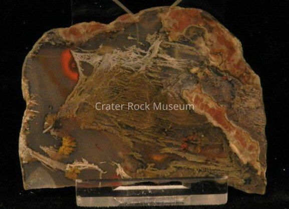 Description: Thin slice with polished face. Translucent tans with some orange patches and a brown splay structure with some spots of reddish-brown