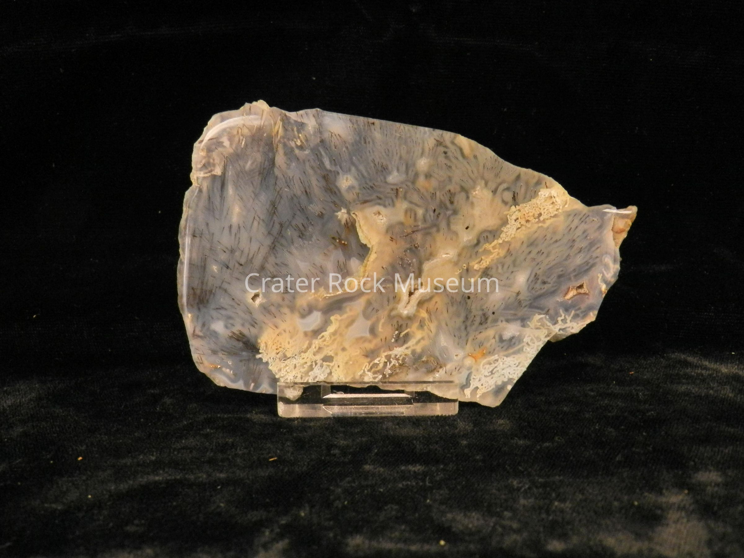 Description: Thin slice with polished face. Transparent smoky blue and tans with numerous "needle-like" black splays with some slight dull lime green present.