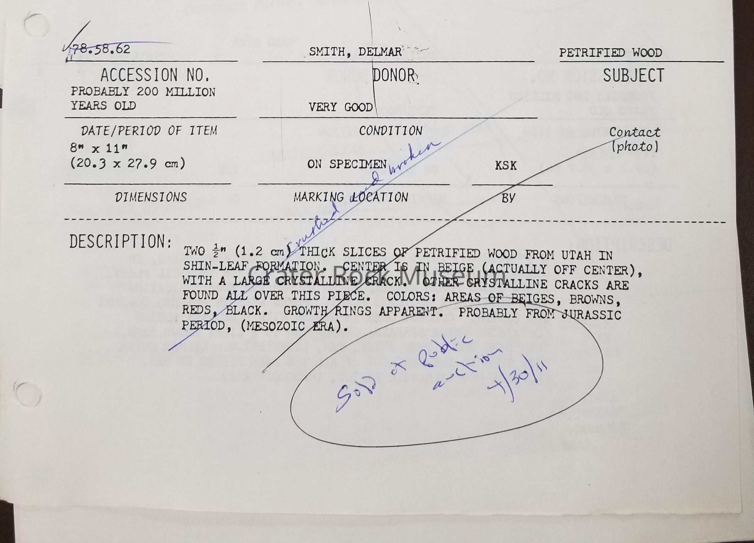 Two 1.2 cm thick slices of petrified wood from Utah in Chinle formation. Off-centered is beige with a large crystalline crack. Other crystalline cracks are found all over the piece. Colors: areas of beige, browns, reds, black. Growth rings apparent. Probably from the Jurassic period, Mesozoic era (~200 mya). (note: it states that the sample is crushed and broken and is crossed out in physical document (see image)). (Sold in public auction 04/30/2011).Collection