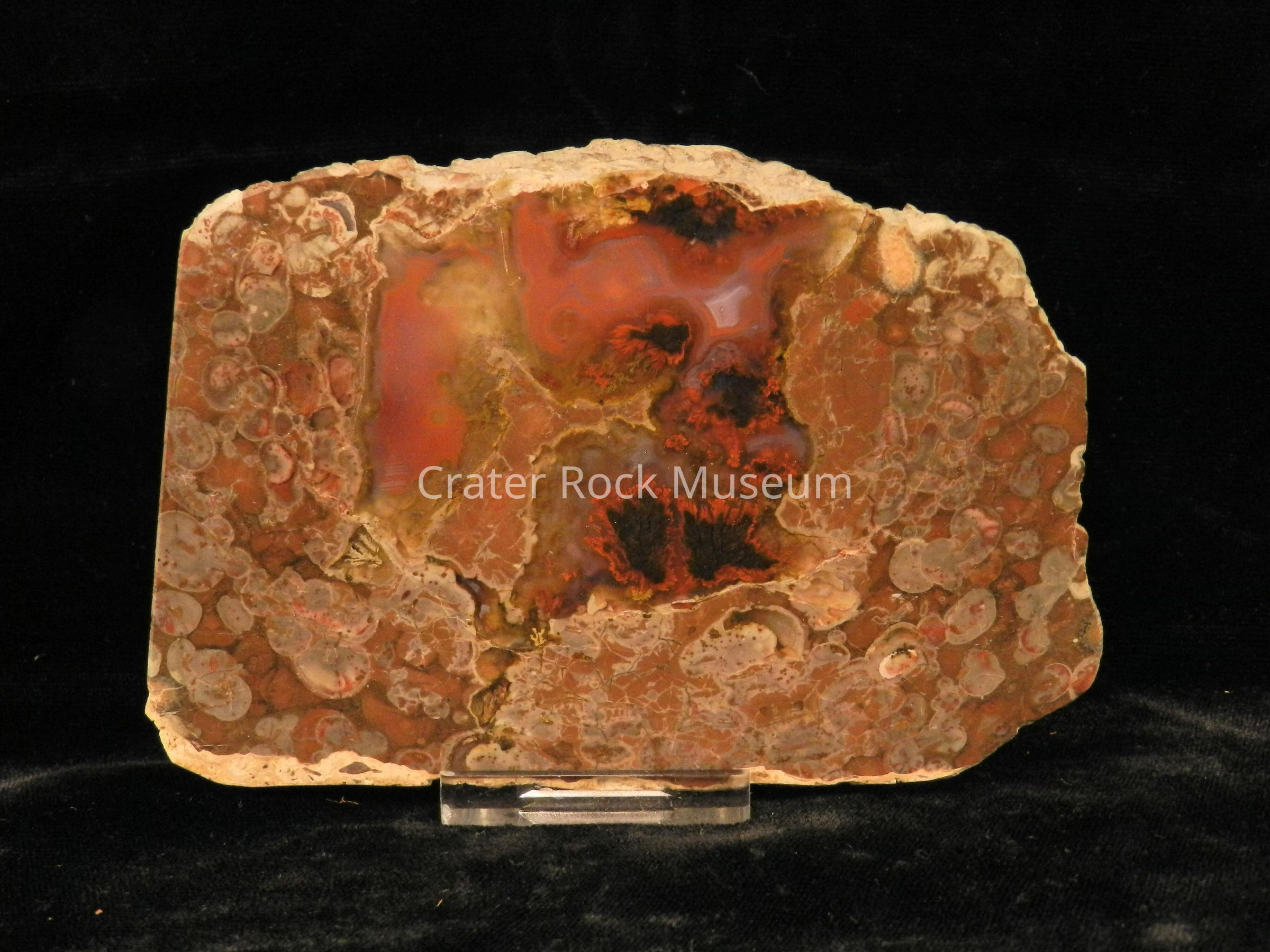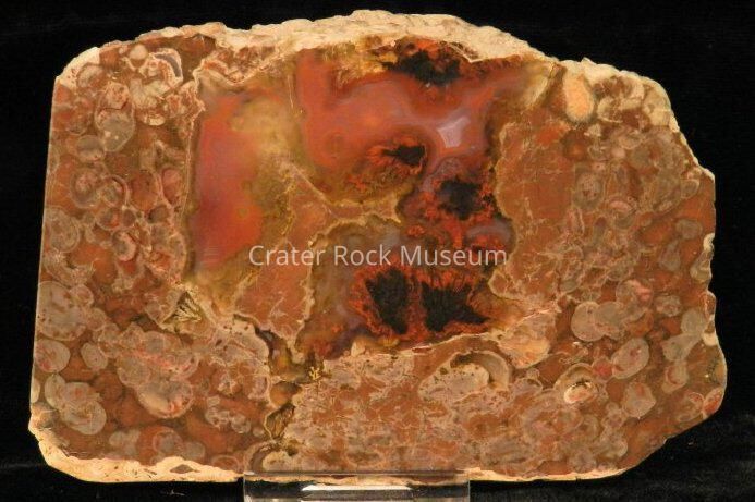 Description: Rough, nodular back with polished face. Translucent brown to olive green orbicular structure on outer areas and dark pink, red to black inner areas.