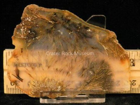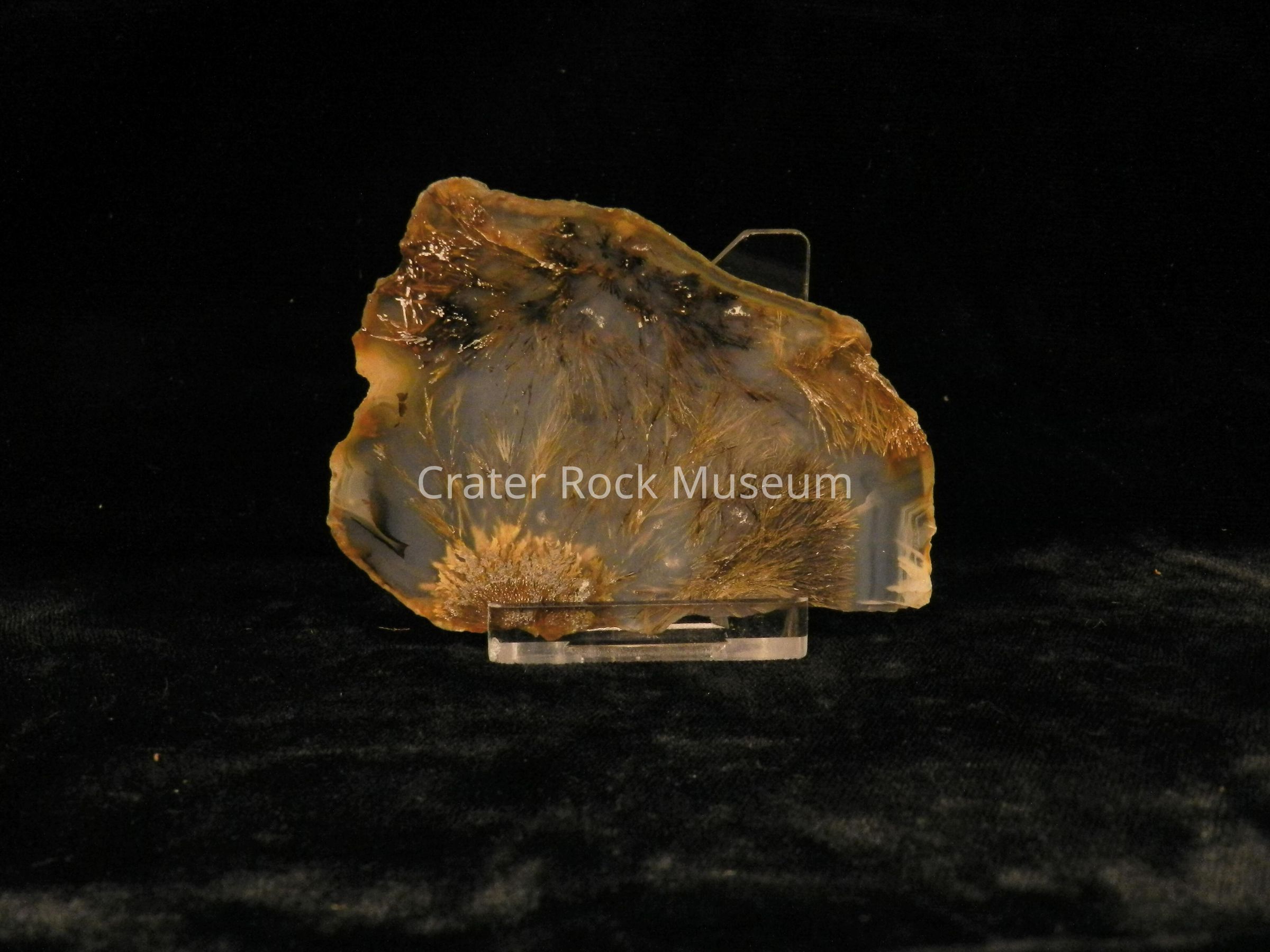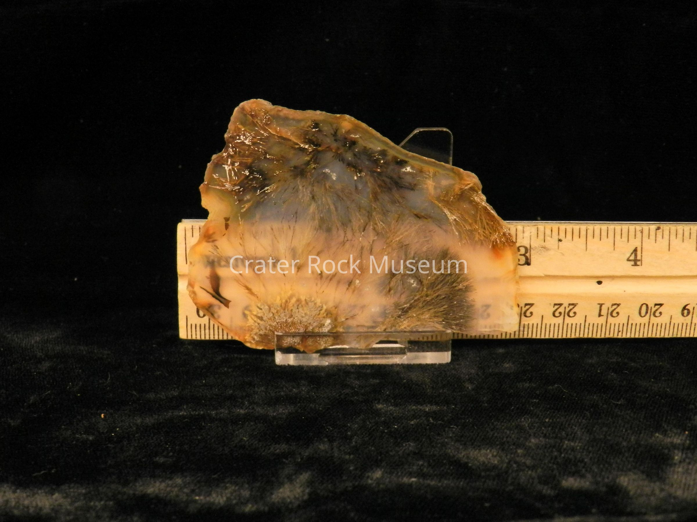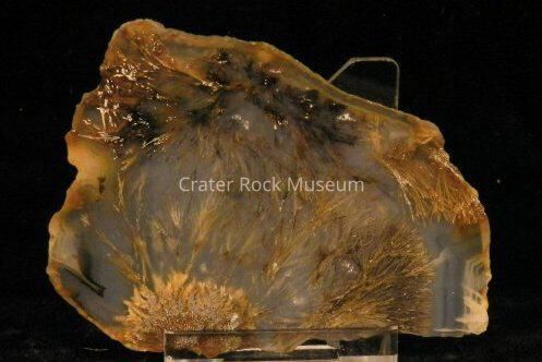 Description: Very thin slice with polished face. Transparent creamy white and tans. (4) distinct hair-like structures present.Collection