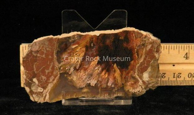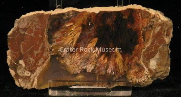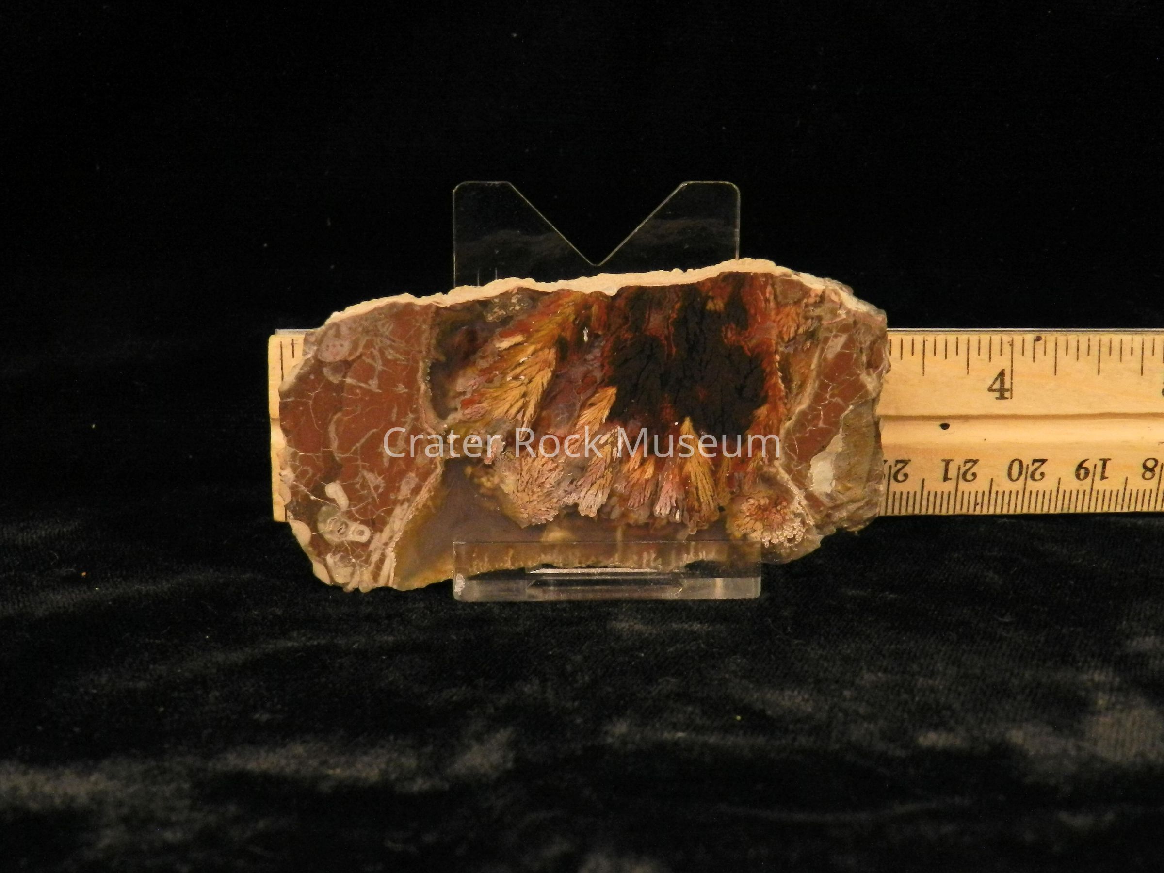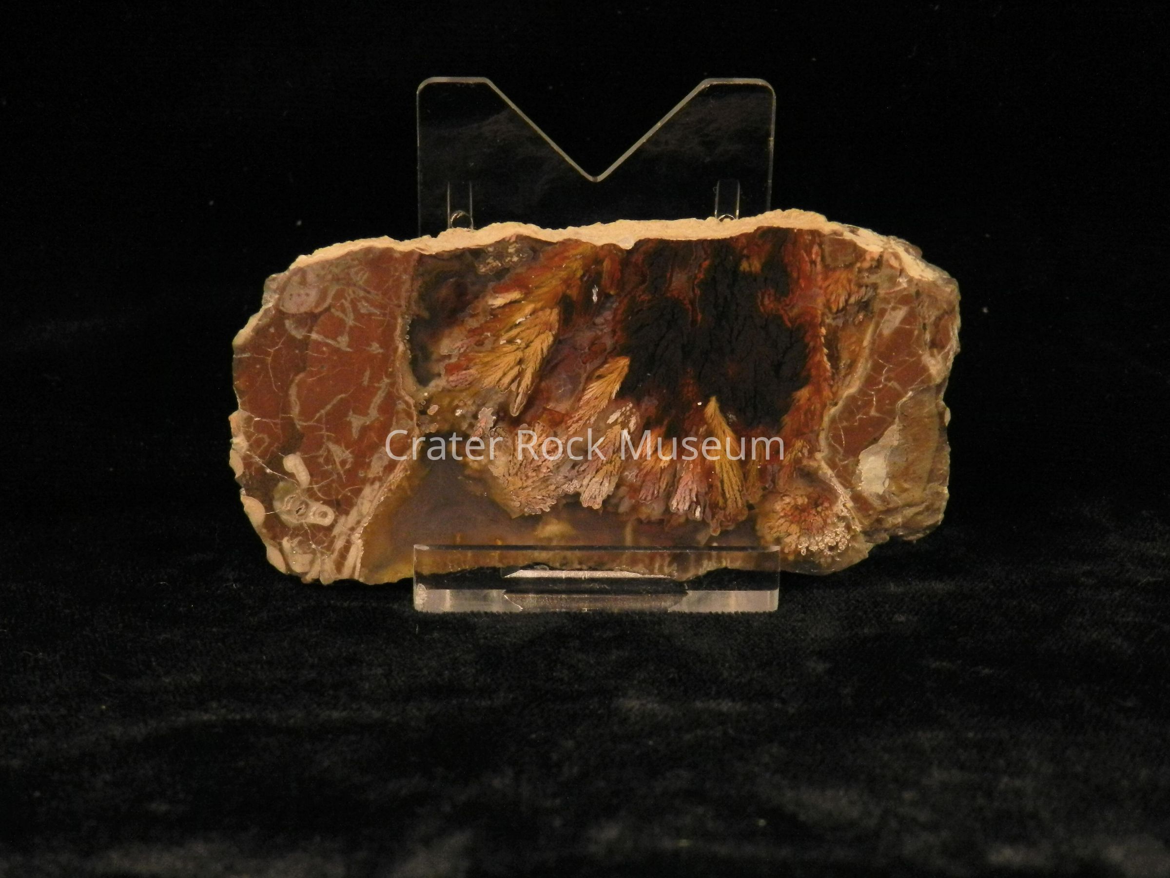 Description: Thick, rough back with polished face. Translucent dark tan with dull yellow and reddish-brown plumes. There is a black area in center of plume.Collection