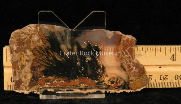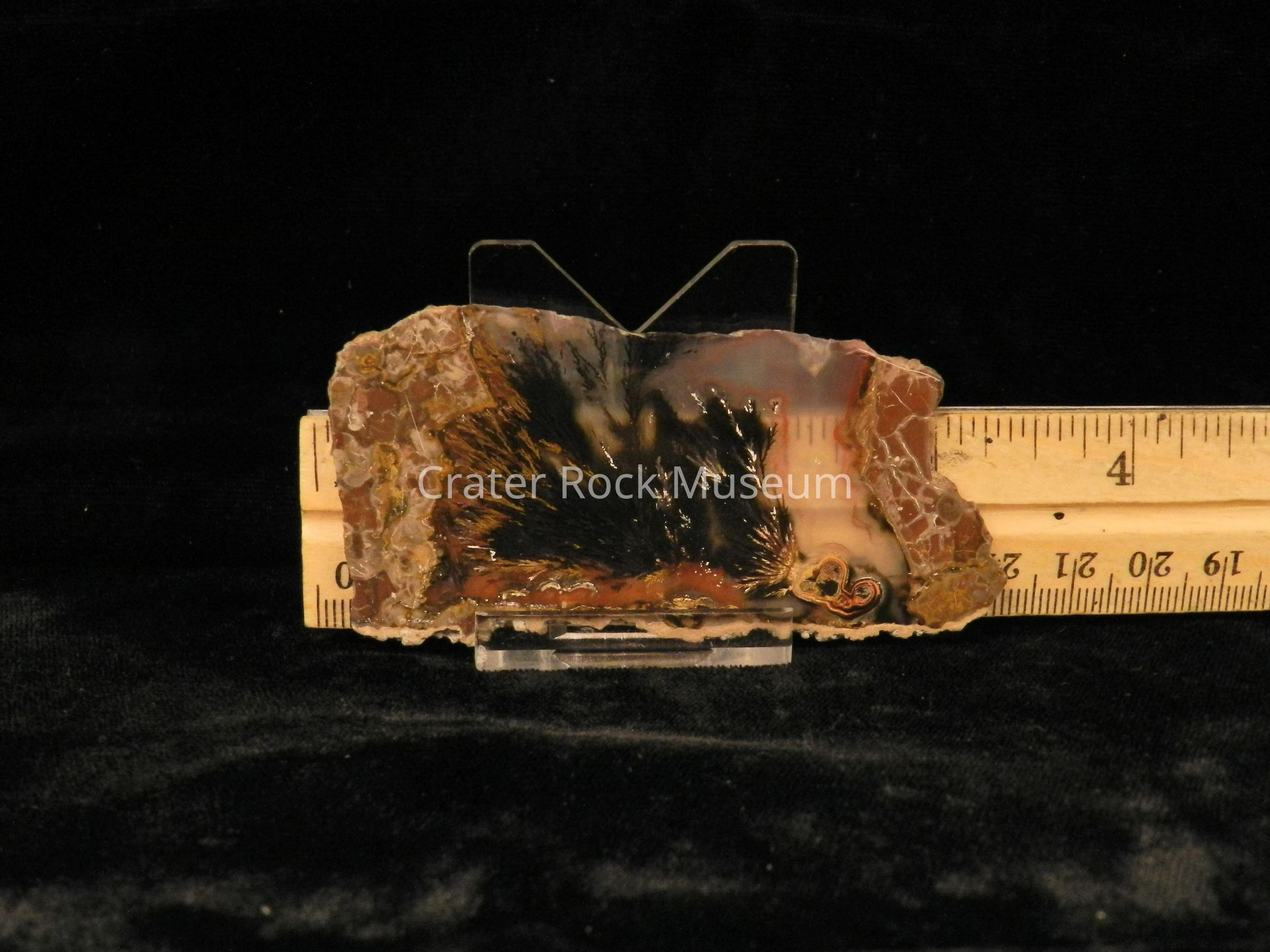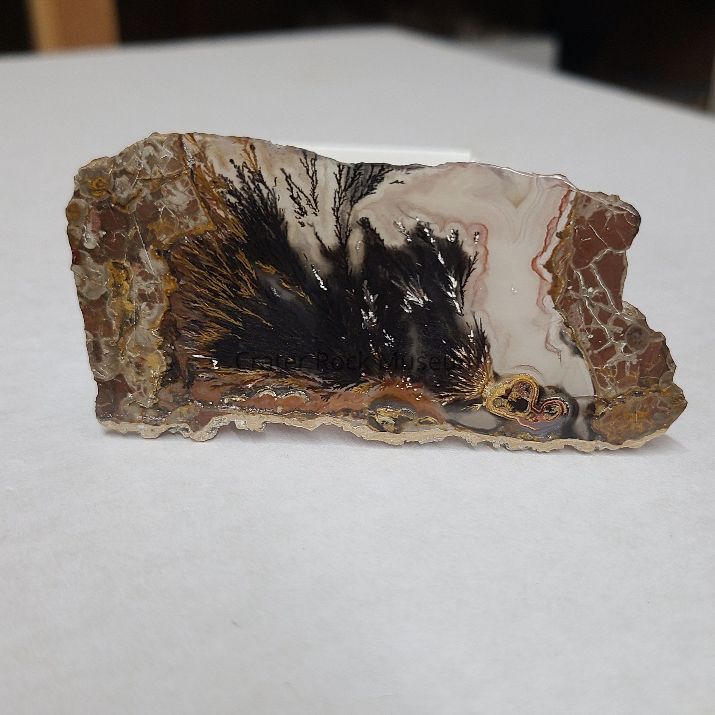 Description: Very thin slice with polished face. Transparent smokey white with some areas of reddish-brown and gray on outer areas with black plume in center.Collection