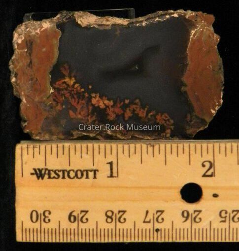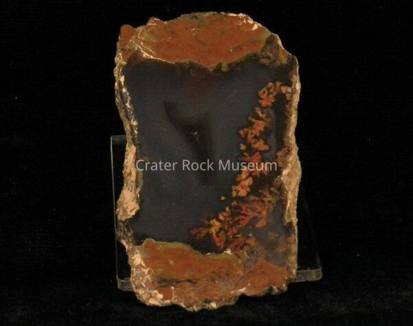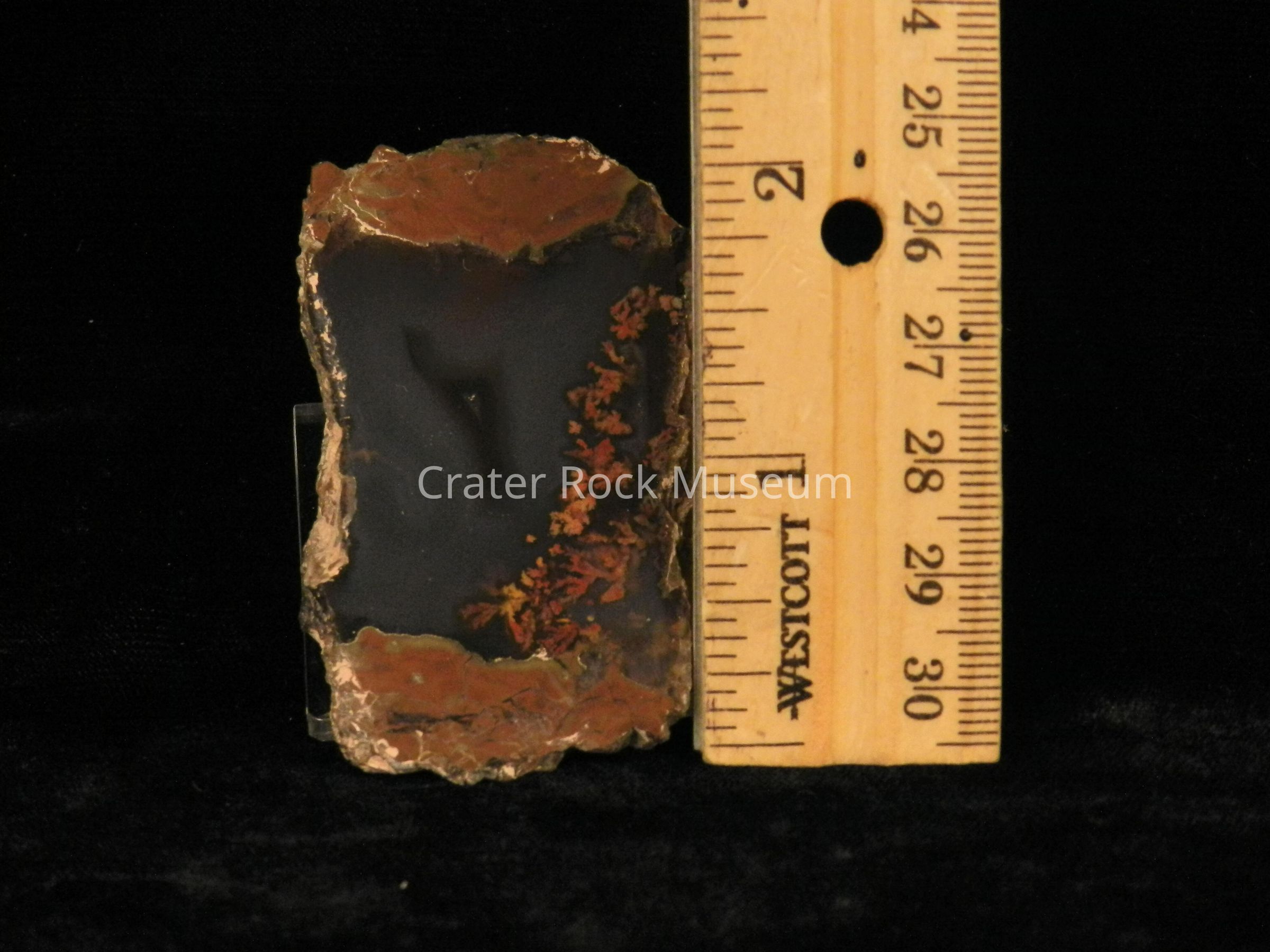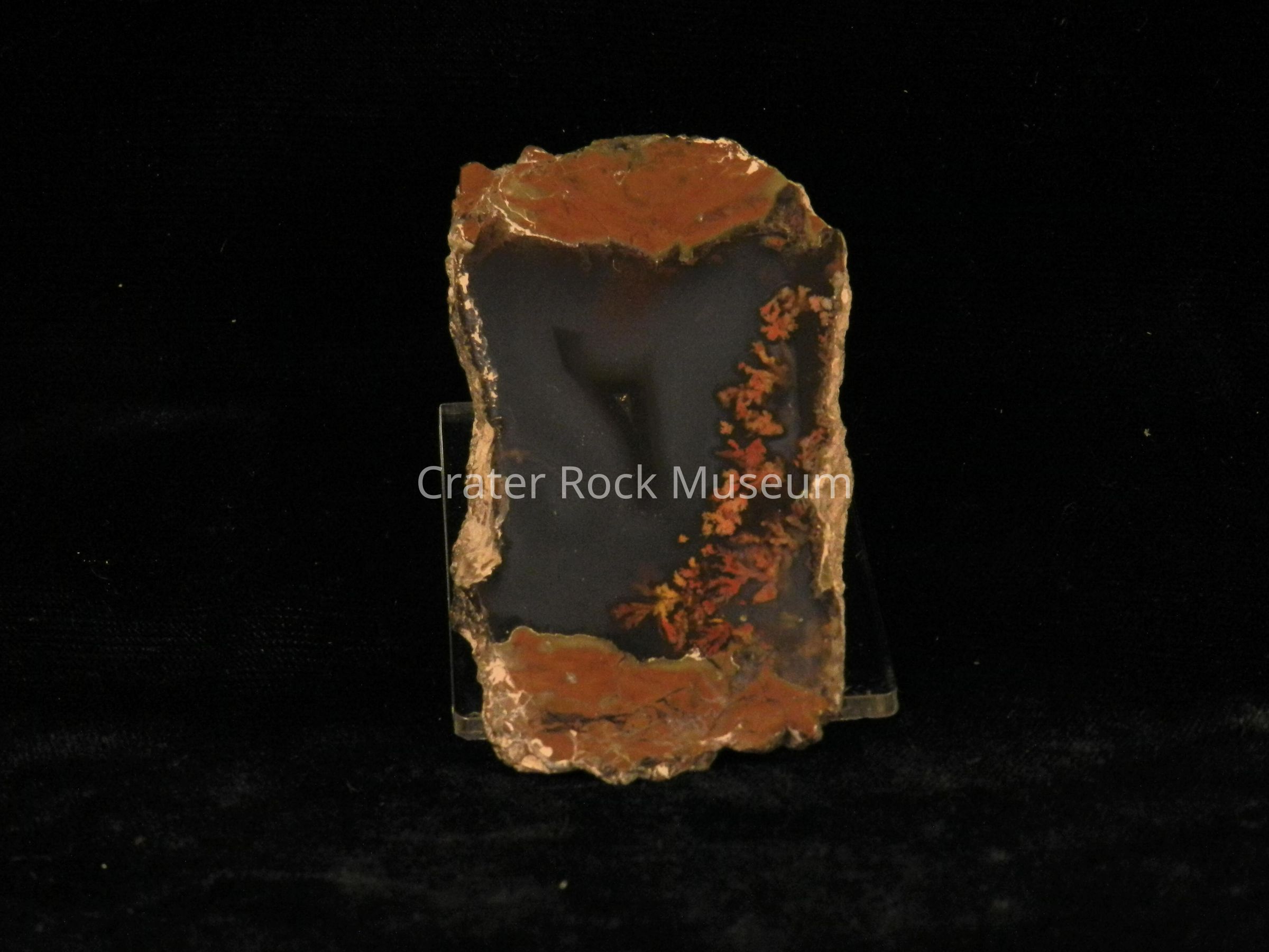 Description: Thick slab with rough, angular back and polished face. (2) small areas of reddish-brown on outer regions and a solid blue-gray and black center area with slight reddish-pink plumes.Collection