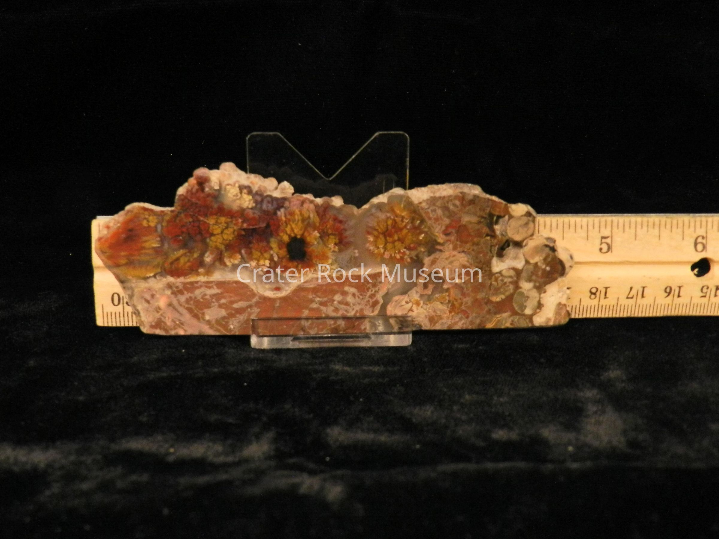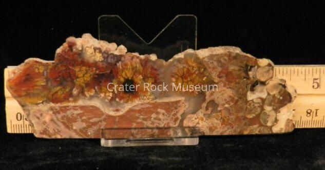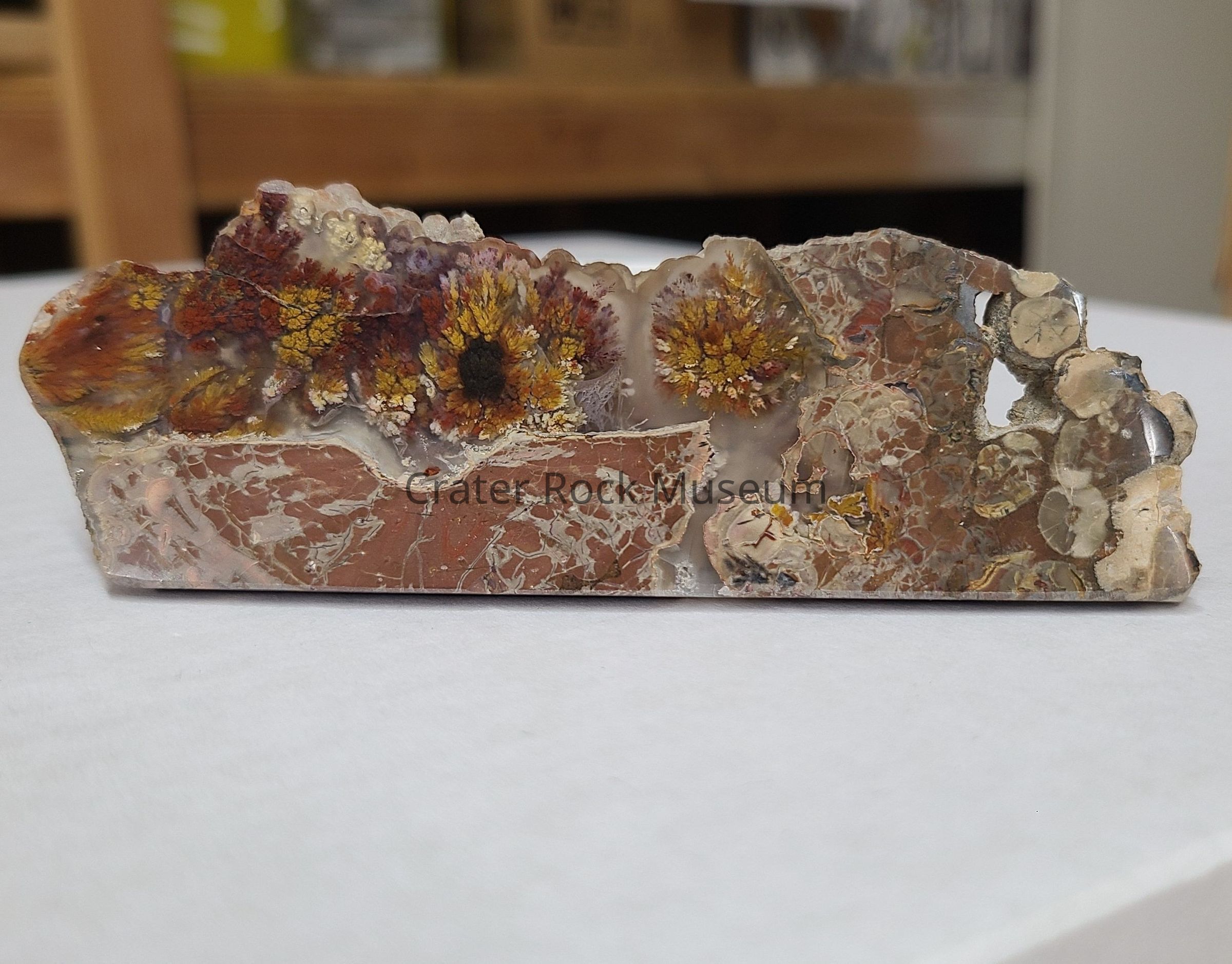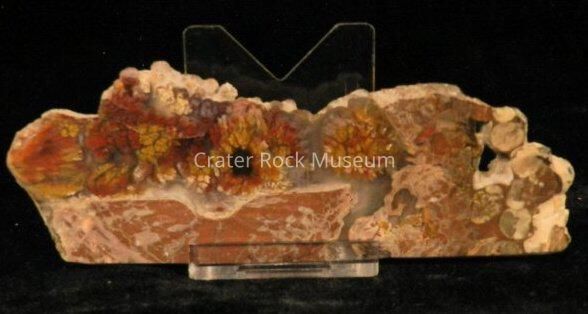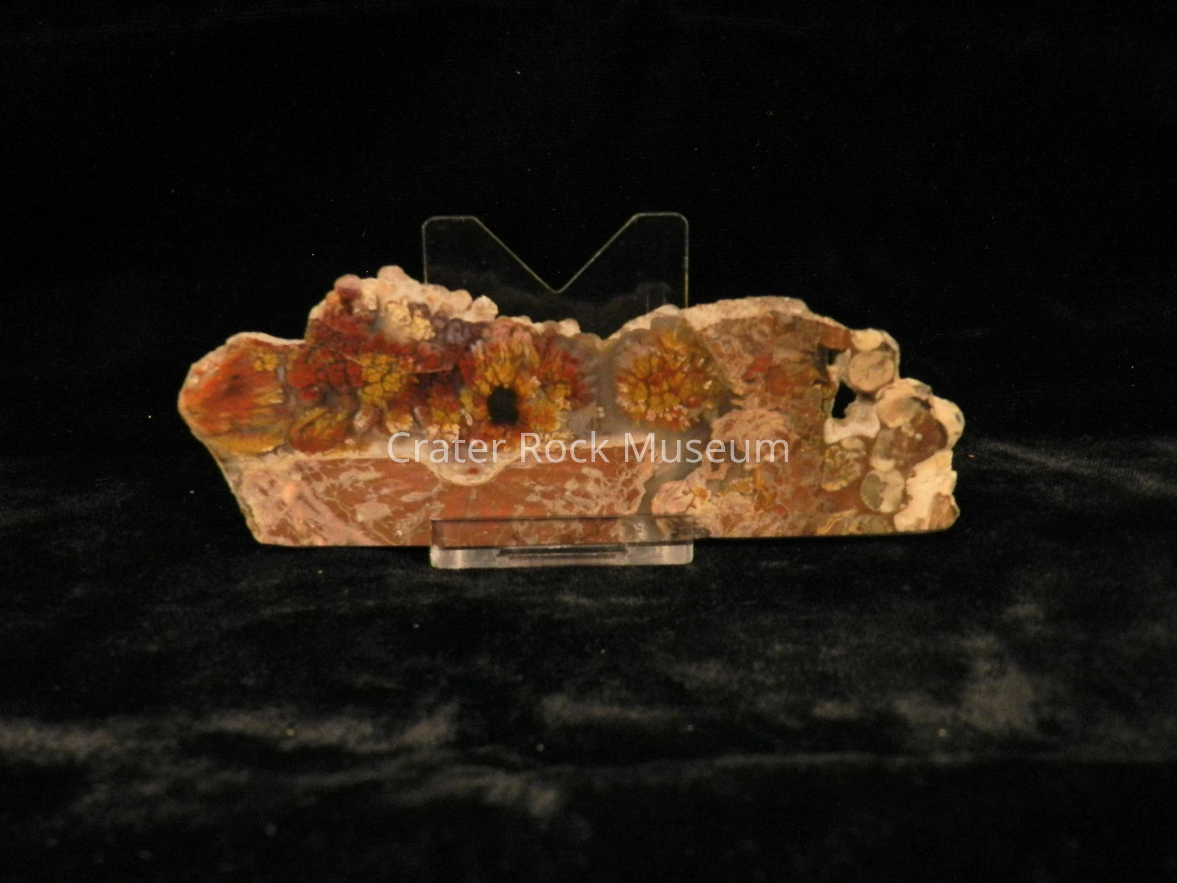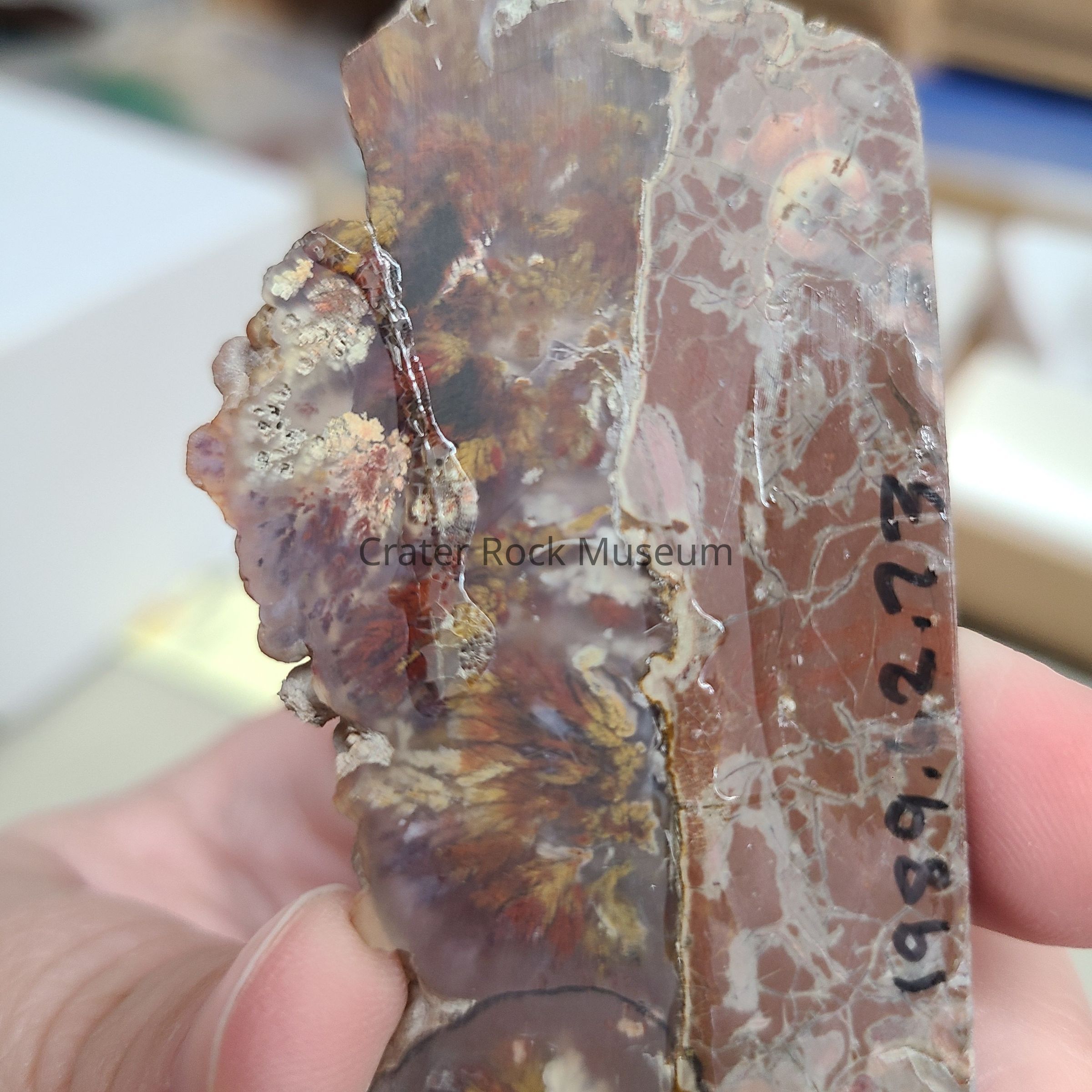 Description: Thin slice with polished face. Various transparent and translucent structures, each different and symmetrical with colors ranging from reddish-brown to dark red, yellow and beige.Collection