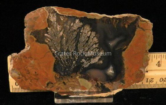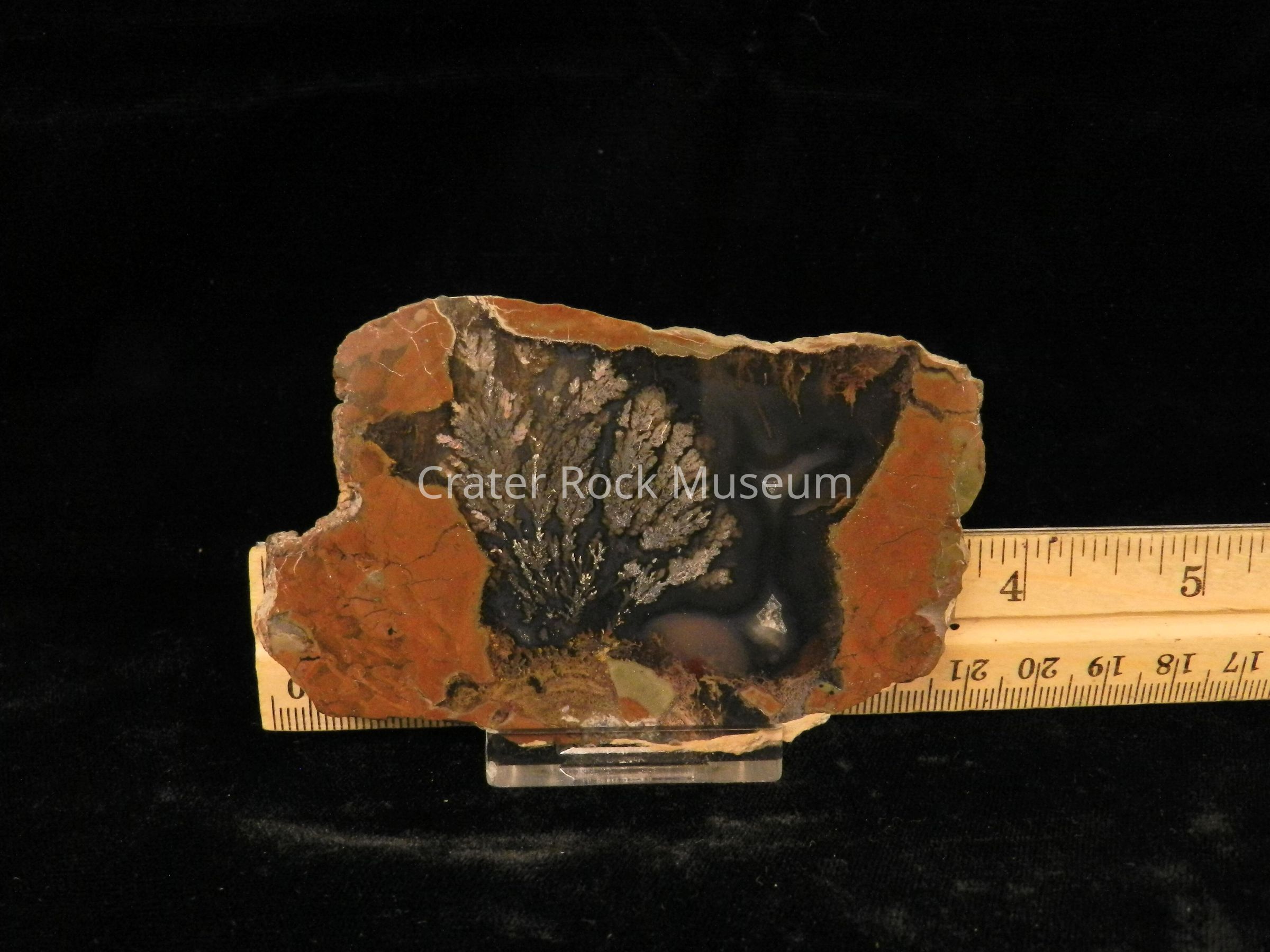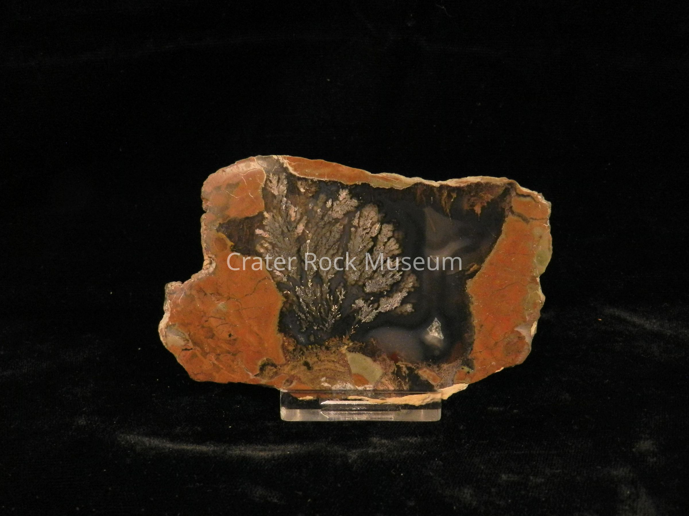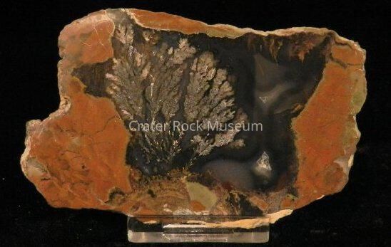 Description: Thin slab with polished face. Reddish-brown outer regions with translucent black and gray, and a gray and beige plume towards center.Collection